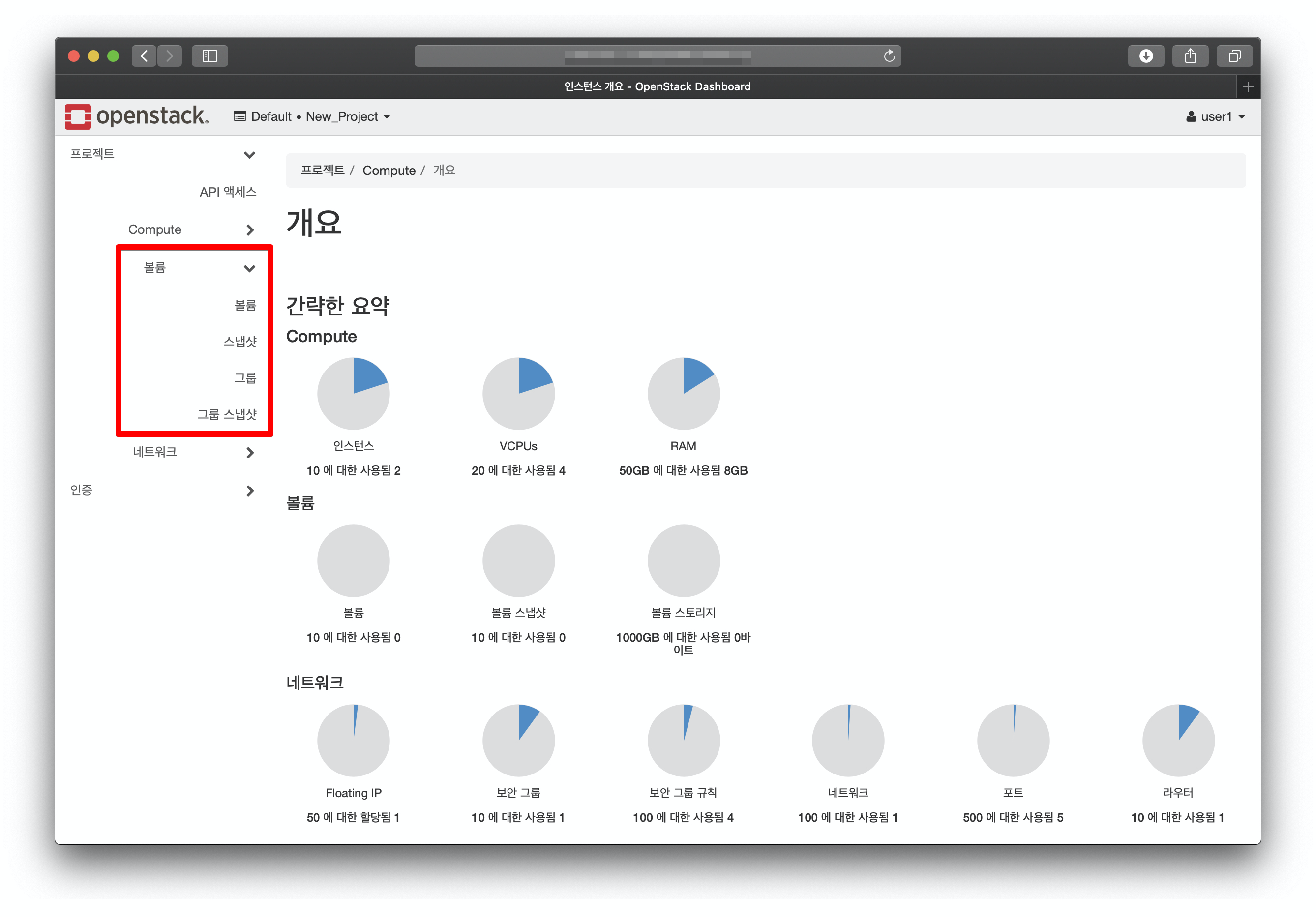 대시보드에서 다음과 같이 '볼륨' 메뉴가 추가되었는지 확인해 봅니다.