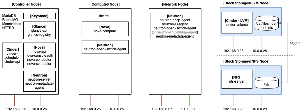 다중 노드로 구성하기 위해 NFS 백엔드 스토리지 전용 노드 (10.0.0.29 서버)가 추가되며, 해당 노드는 cinder와 같은 오픈스택 관련 서비스 없이 nfs 기반의 저장 공간을 제공하는 노드로 운영됩니다. 여기에서 그림과 같이 /nfs 디렉토리는 기존 스토리지 노드의 mnt_nfs 디렉토리로 마운트 되어 구축될 예정입니다.