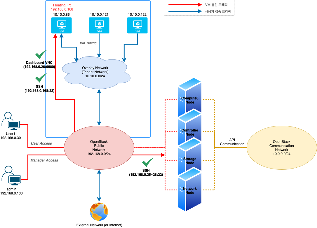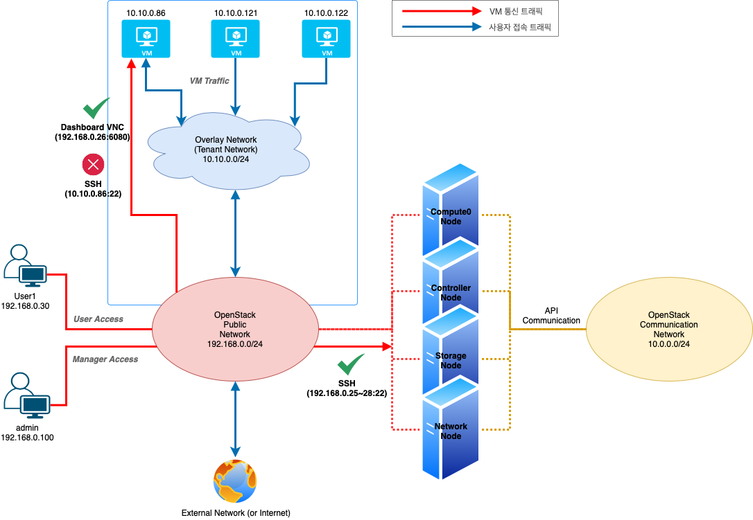문제는 아래와 같이 VM에 ssh로 접근할 수 없다는 점입니다. 관리자(admin)나 클라우드 시스템을 사용하는 사용자(user1)는 모두 현재 오픈스택 시스템에 접근할 수 있고, 여기에서 동작하는 VM에 대시보드 VNC의 6080 포트를 사용하여 접근할 수 있는 상태에 있습니다. 기본적으로 Nova 서비스가 오픈스택 대시보드를 통해 VNC 콘솔 기능을 제공하고 있기 때문입니다.