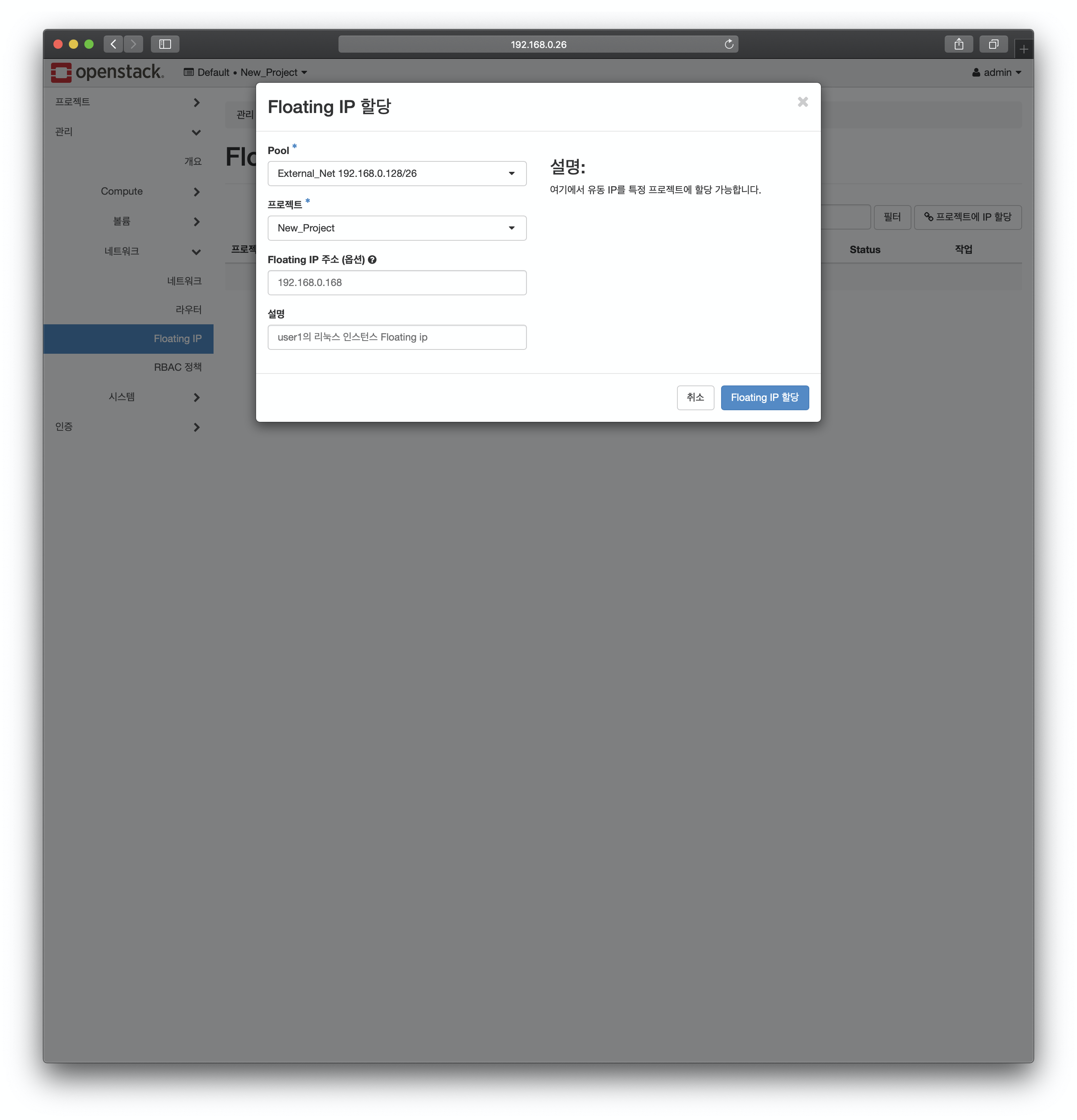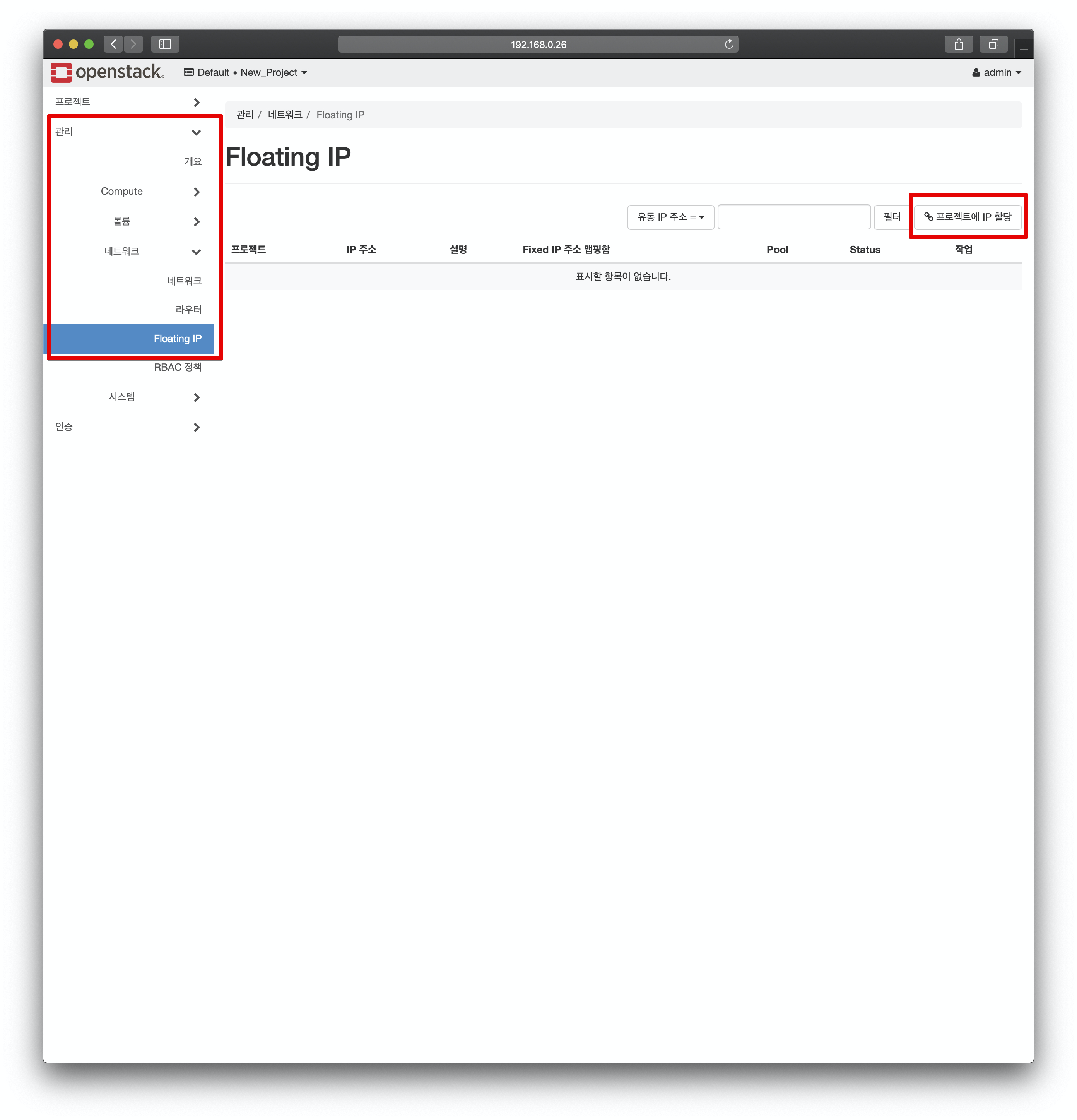 우선 admin 계정으로 대시보드에 로그인 후, 아래와 같이 "관리-> Floating IP-> 프로젝트에 IP 할당"을 클릭합니다.