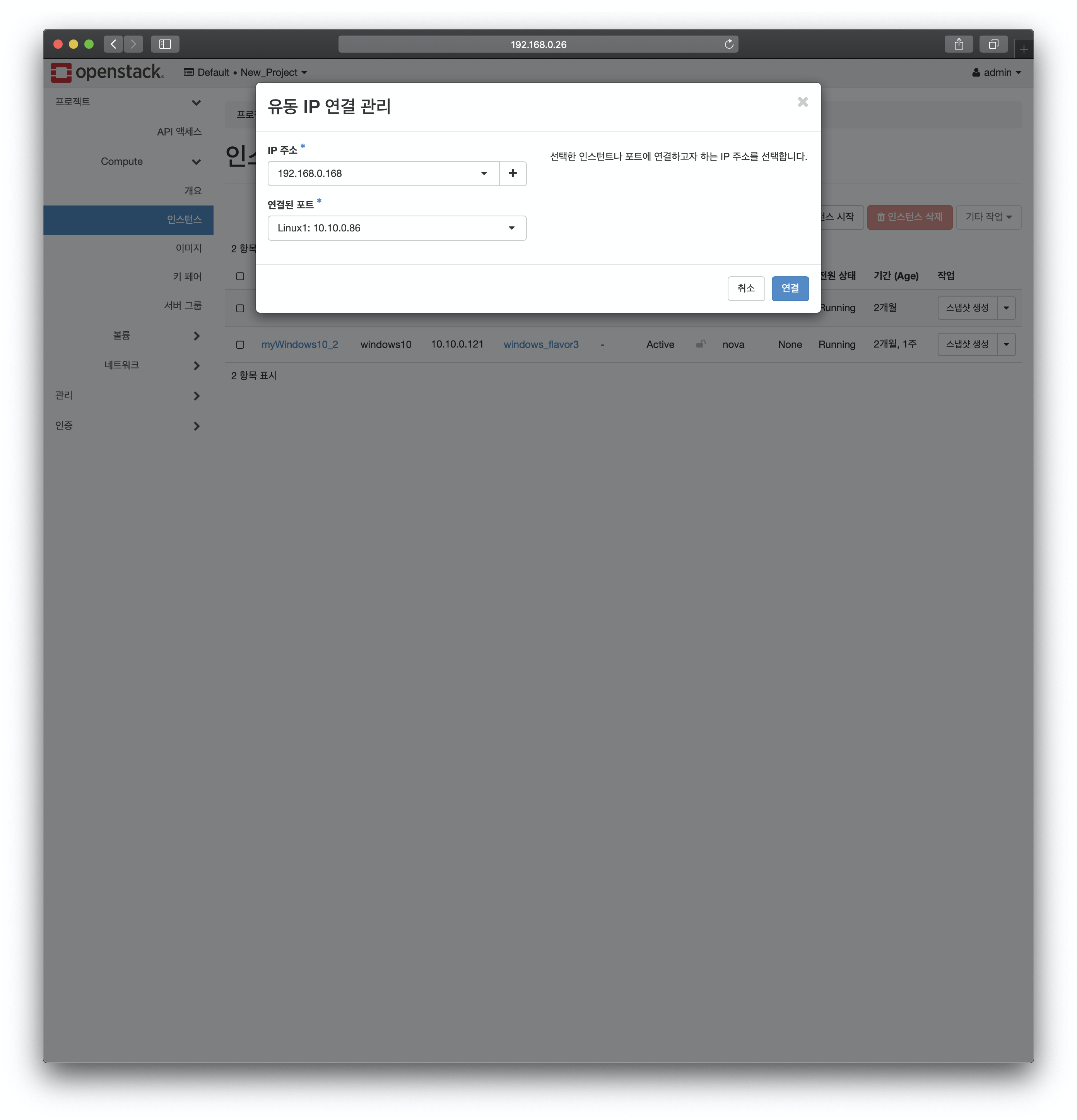아래와 같이 우리가 생성한 ip, 그리고 이 floating ip를 연결할 인스턴스의 private ip를 각각 선택해주고 연결을 클릭합니다.