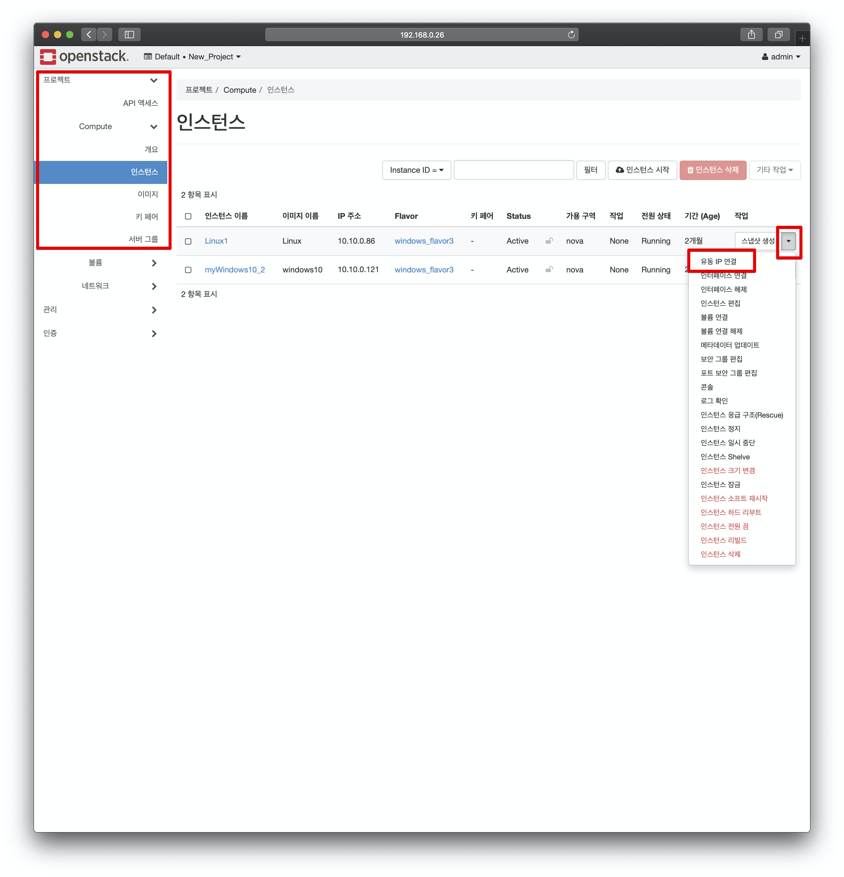 다음으로 "프로젝트-> Compute-> 인스턴스-> (인스턴스의) 작업-> 유동 IP 연결"을 클릭합니다. (물론 user1으로 로그인하여 진행해도 됩니다.)