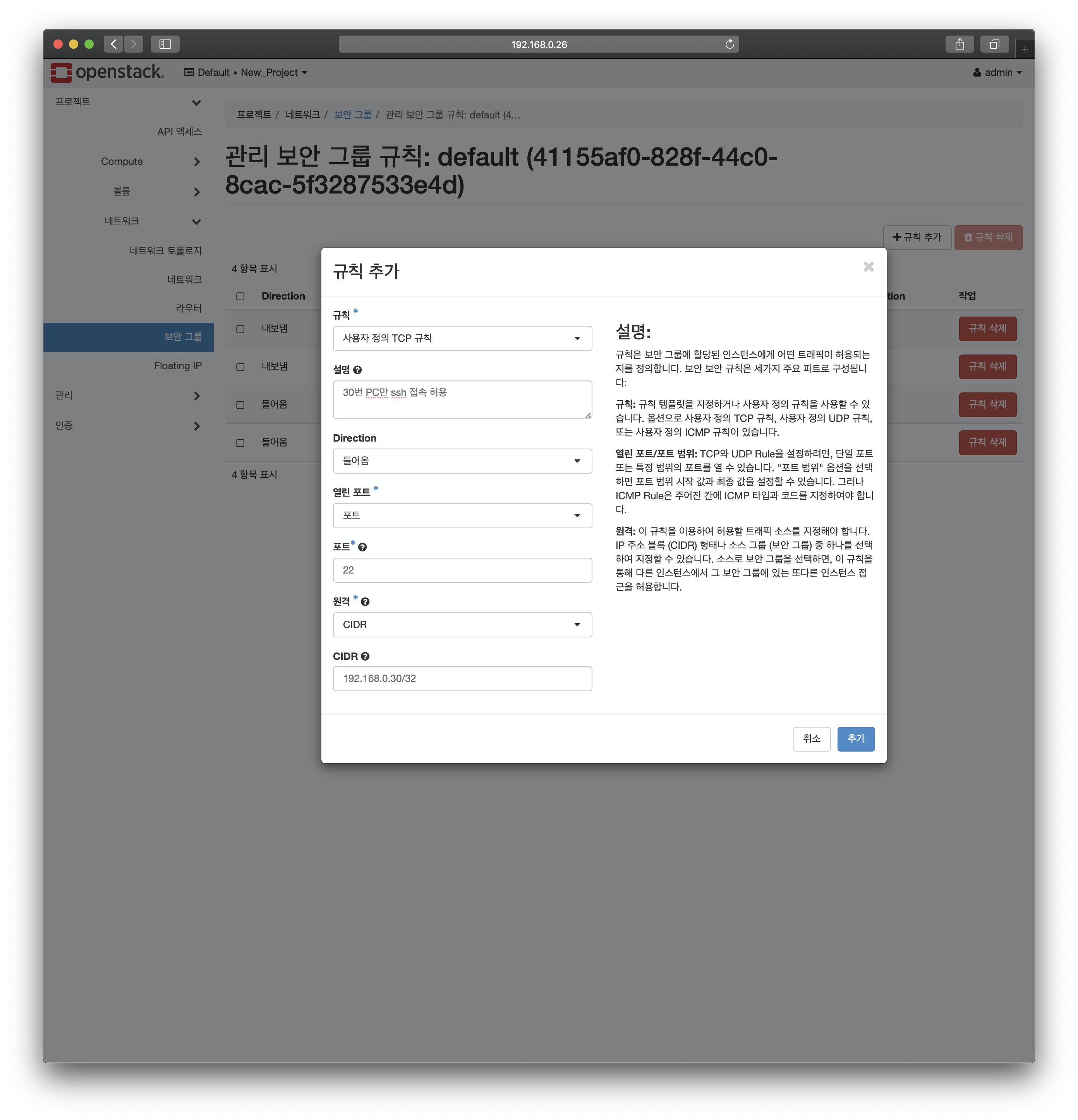 - CIDR: 외부에서 접속할 네트워크 혹은 단일 PC의 ip 선택 (예시에서는 192.168.0.30번만 허용하도록 설정)