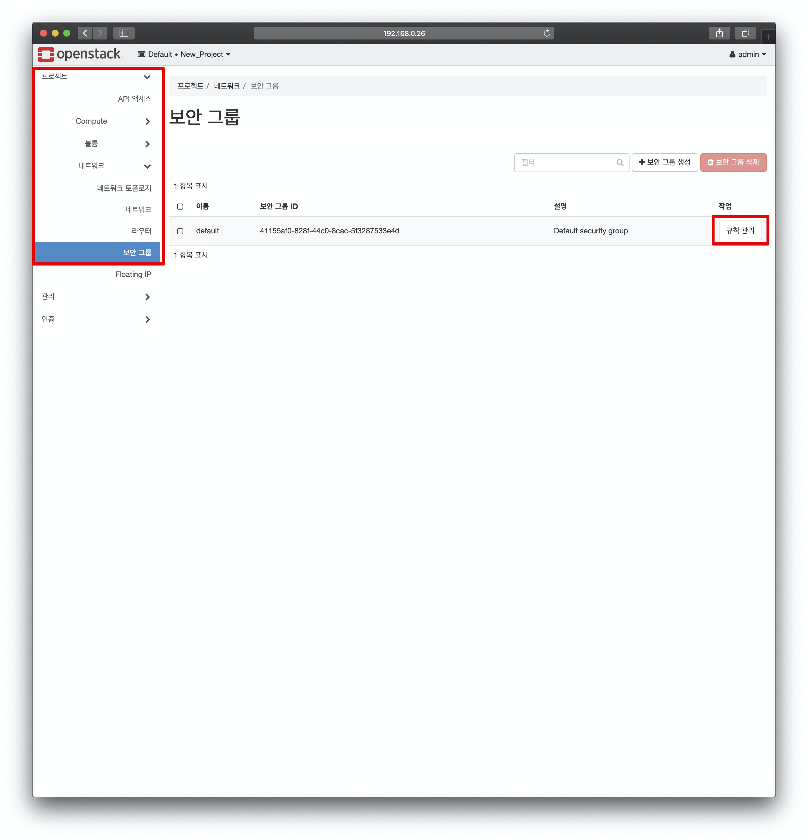보안 그룹을 설정하기 위해 "프로젝트-> Compute->네트워크-> 보안 그룹"으로 이동해 봅니다. 아래와 같이 default 방화벽 규칙이 생성되어있는 것을 볼 수 있습니다. 해당 보안 그룹의 규칙 관리를 클릭합니다.