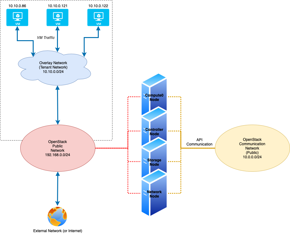 현재 모든 VM은 10.10.0.0/24 네트워크에 구성되어 있으며, 이 네트워크는 VxLAN 기반으로 생성된 가상의 오버레이 네트워크입니다. 이 VM에서 생성되어 외부로 향하는 모든 트래픽은 외부망인 192.168.0.0/24 네트워크의 ip로 NAT 되어 외부망으로 향하도록 구성되어 있습니다. (현재 저의 오픈스택 기준으로 이들의 게이트웨이는 192.168.0.159로 지정되어있으나, 그림에서 디테일하게 여기까지 표현하지는 않았습니다)