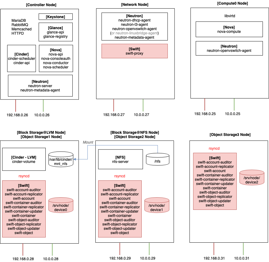 실제 데이터를 저장하고 관리할 오브젝트 스토리지 노드는 총 3개의 노드로 구성됩니다. 오브젝트 스토리지 노드는 비정형 데이터를 분산 저장하기 위해 다중 노드로 구성됩니다. 기본 총 3개 이상의 노드를 구성하도록 되어있습니다. 저는 이를 위해 위와 같이 기존 블록 스토리지(Storage@LVM, Storage@NFS)를 각각 Object Storage1,2로 구성해 보도록 하겠습니다. 추가로 Object Storage3의 경우, 별도의 호스트 장비를 1개 추가하여 구성해 보도록 하겠습니다.