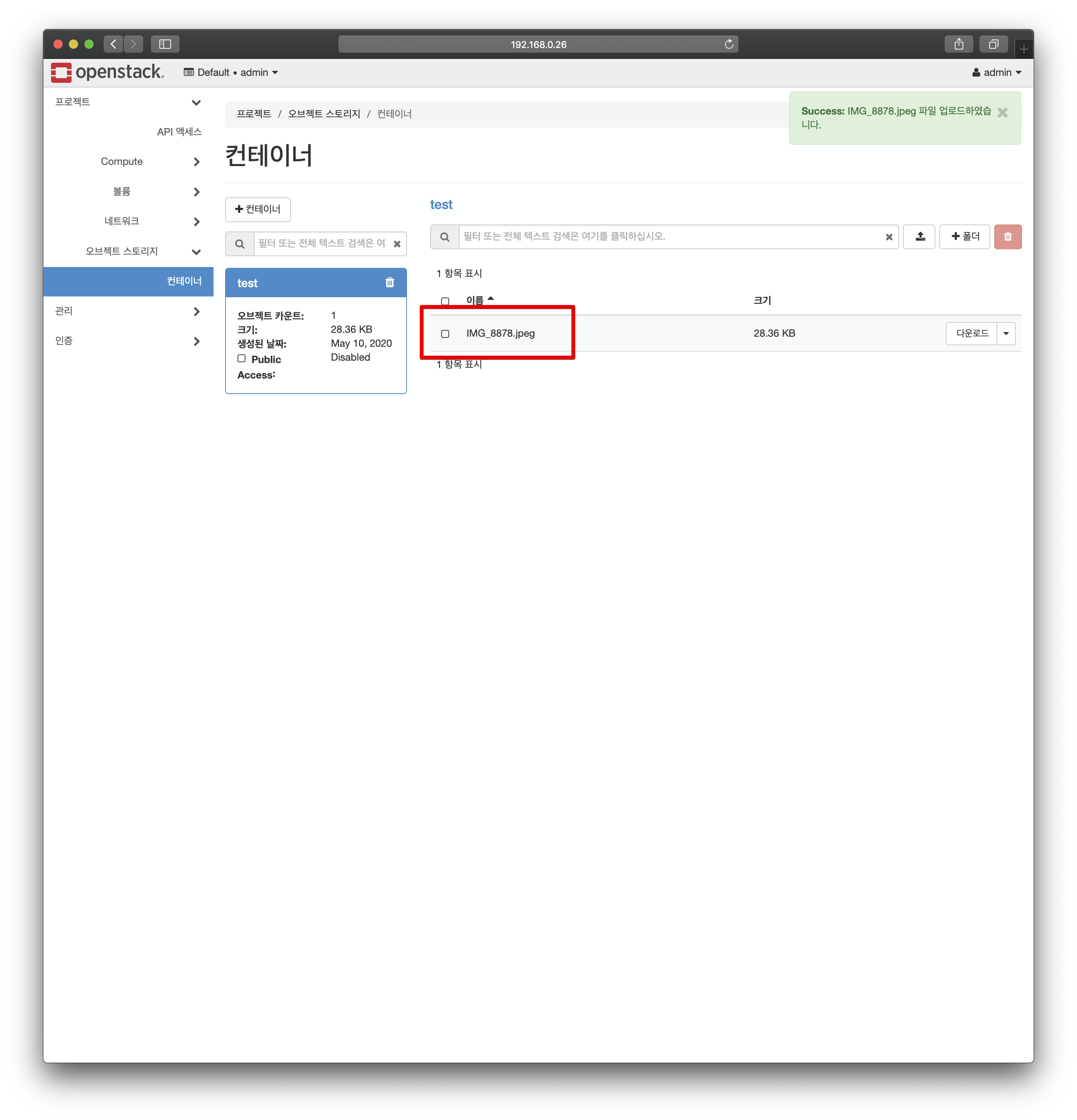 대시보드 접속 후, 아래와 같이 "프로젝트->오브젝트 스토리지" 메뉴가 있는지 확인해 봅니다. 이후 "컨테이너"로 들어가 봅니다.