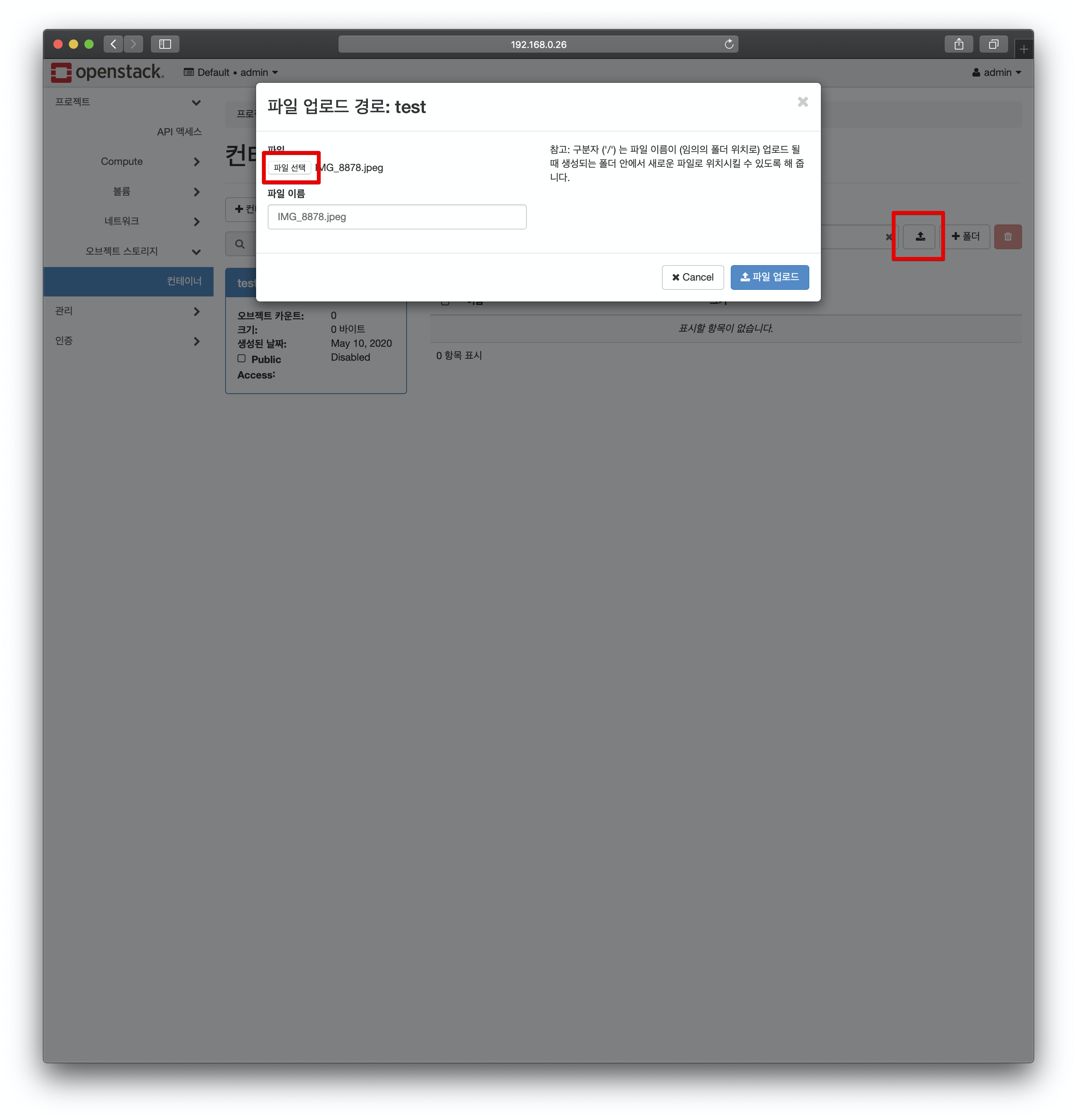 해당 컨테이너에 파일이 업로드 되는지 확인해 봅니다. 아래와 같이 업로드 버튼(화살표모양)을 클릭 후, "파일선택"을 클릭하여 아무 파일이나 선택하고 "파일 업로드"를 클릭해봅니다.