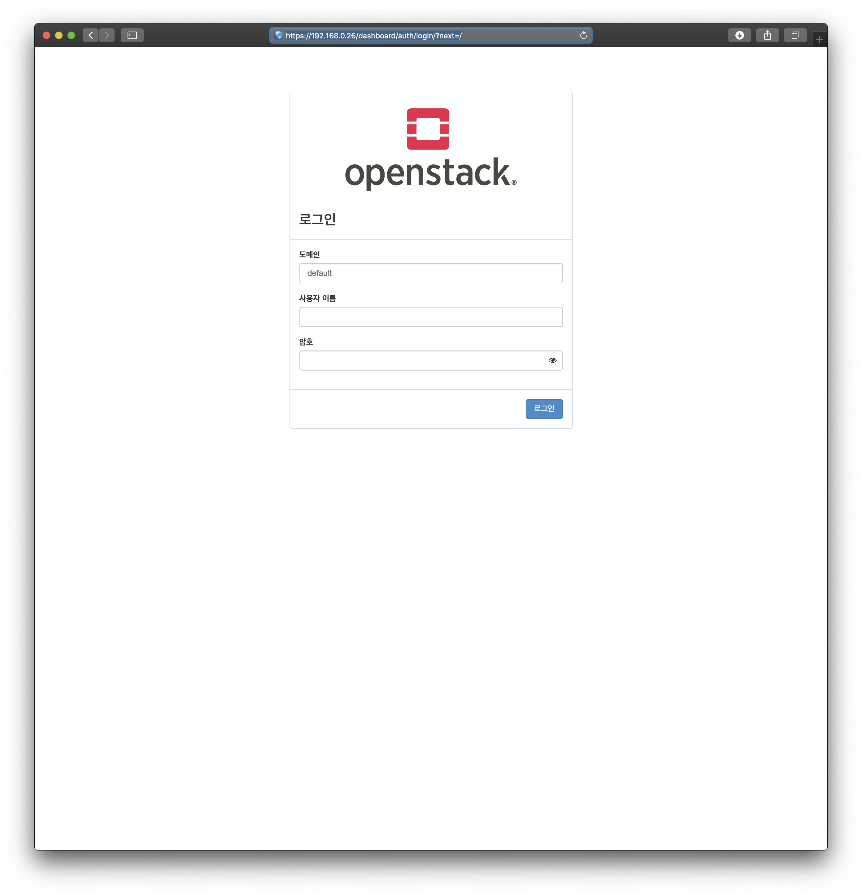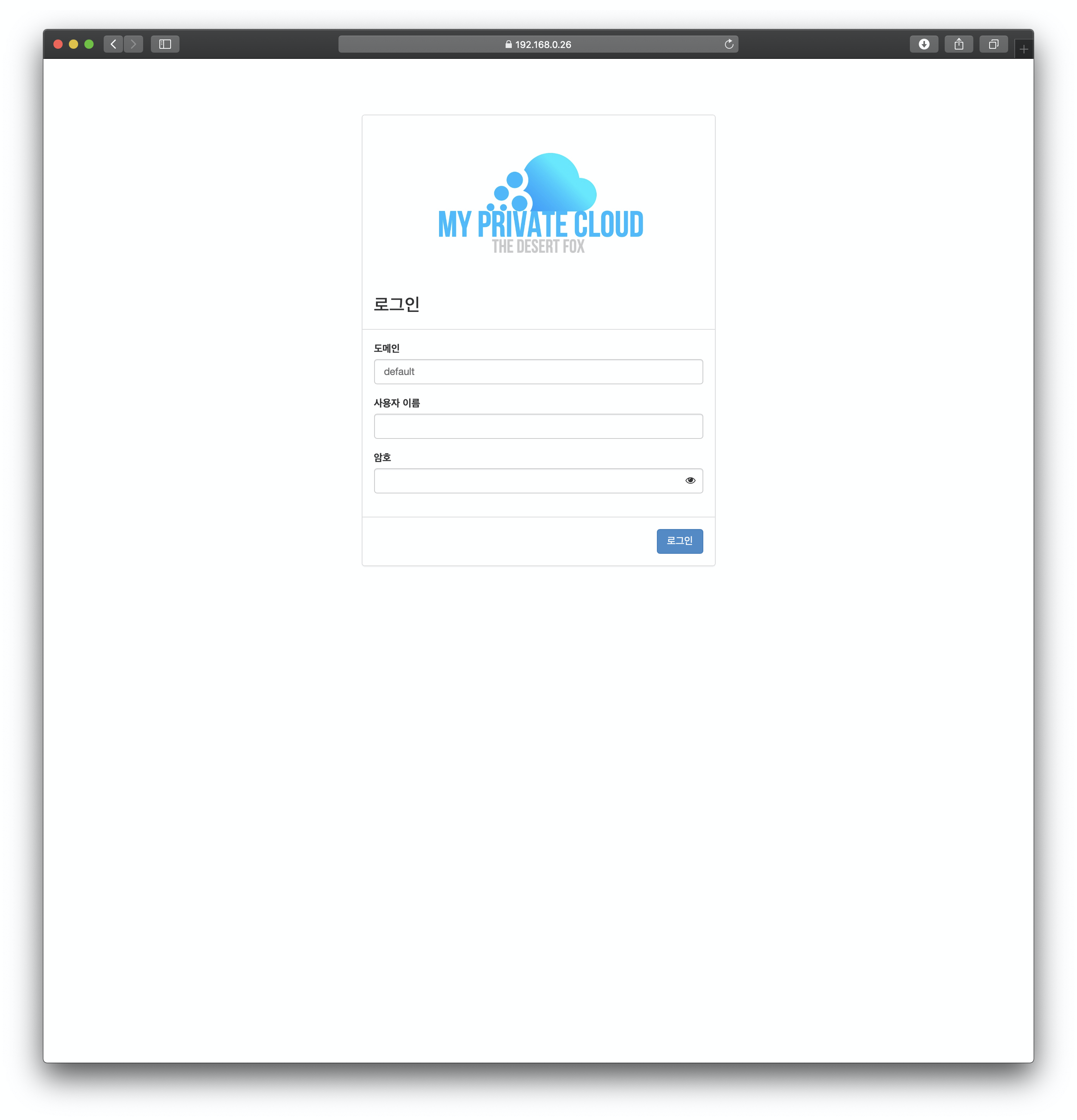 현재 저의 CentOS7 HTTP 서비스 기반 대시보드 로그인 화면은 아래와 같이 기본 오픈스택 로고가 박힌 화면입니다.