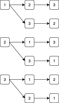 - 3개의 원소에서 2개의 순열 구성: 3P2. 가능한 구성: {1,2}, {2,1}, {2,3}, {3,2}, {3,1}, {1,3}