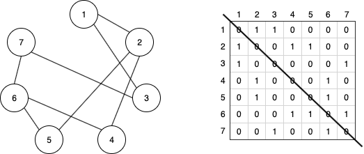 예) 1열 2행: 정점 1과 2간에 서로 연결됨. 4열 3행: 정점 4와 3간에 서로 연결되지 않음