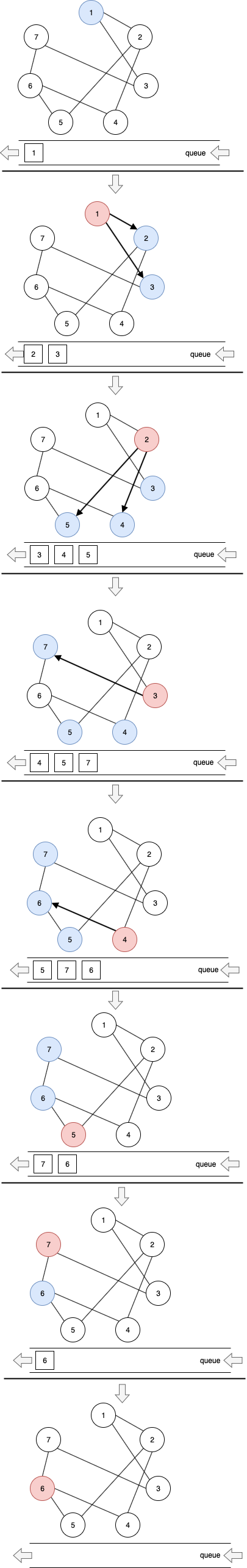 (참고: 파란색 정점: queue에 push 하거나 이미 저장되어 있는 정점. 빨간색 정점: pop 된 정점)