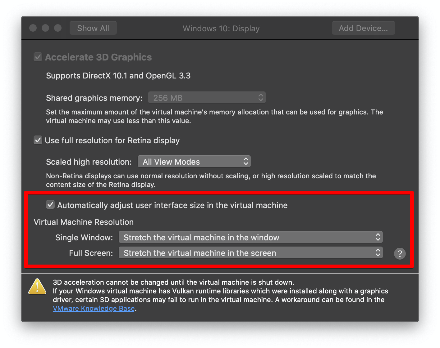 "VMware Fusion 메뉴 -> Preferences -> Display "