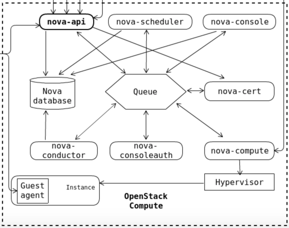 - nova-api 서비스: 최종 사용자의 API 콜을 통해 서비스 간 질의 응답을 담당합니다. 주로 Openstack의 다른 서비스 API 와 통신하며, 외부 Amazon EC2와 같은 서비스와도 연계할 수 있습니다.