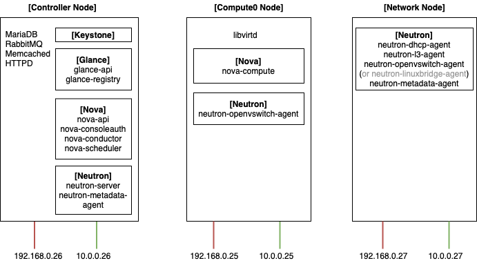 이번 네트워크 서비스를 구성하는 과정에서 위와 같이 총 3개의 노드가 구축됩니다. 기본적인 네트워킹 기능은 Neutron을 통해 제공되며, VM이 Neutron을 통해 네트워킹 서비스를 활용할 수 있어야 하므로 Nova 서비스와 상호작용 합니다.