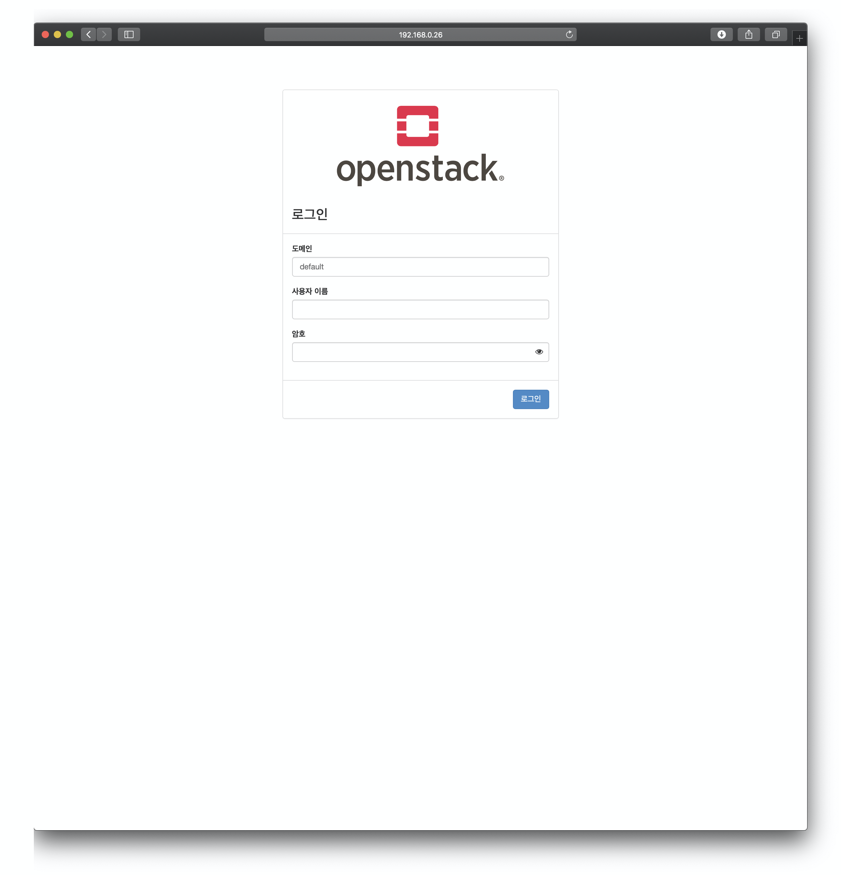 아래와 같이 외부에서 대시보드에 접속할 수 있는지 확인해 봅니다. 물론 외부에서 접속하기 위해 192.168.0.26(컨트롤러 노드의 관리망 IP)을 사용할 수 있도록 하였으므로, 해당 IP와 같은 대역에 있는 외부 PC에서 접속을 시도해 봅니다.