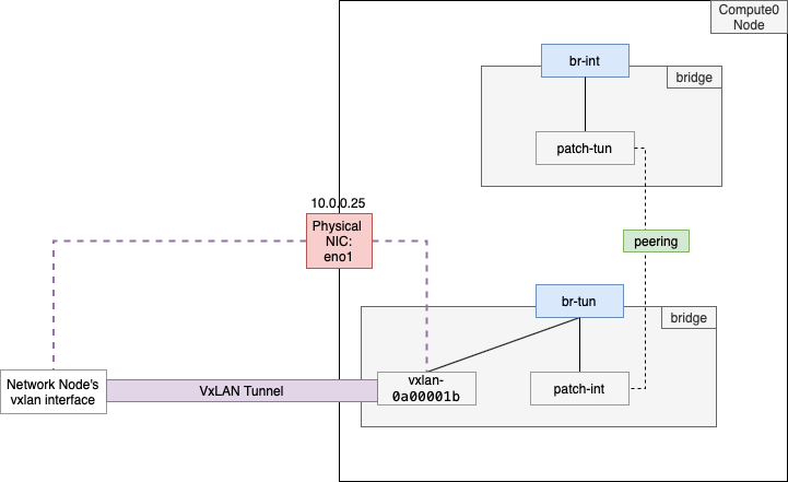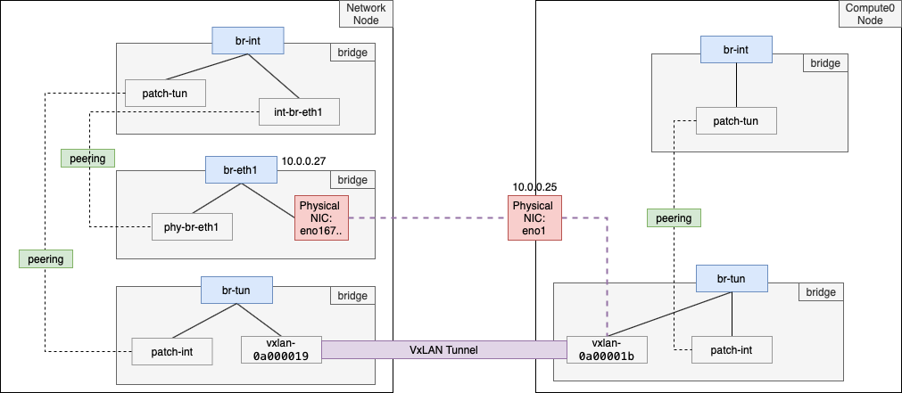 또한 컴퓨트 노드와 마찬가지로 네트워크 노드에서도 br-tun과 br-int 간의 연결을 위한 패치 인터페이스(patch-tun, patch-int)를 확인할 수 있습니다. 또 컴퓨트 노드와의 터널링을 위한 vxlan 인터페이스(vxlan-0a000019)도 역시 확인할 수 있습니다.