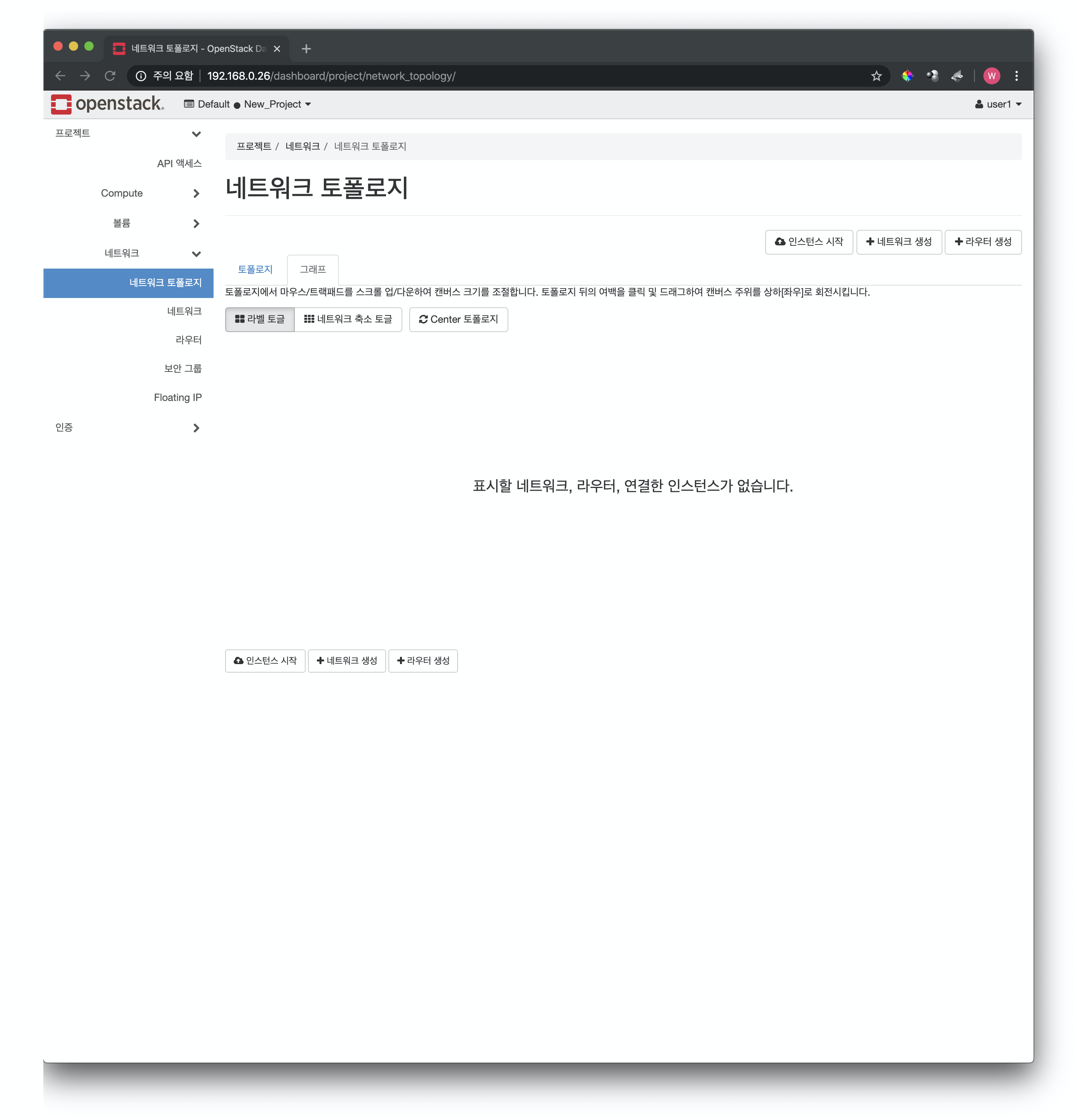 앞서 저는 시나리오에서 "New_Project의 일반 사용자는 토폴로지에서 볼 수 없음" 이라고 정의했는데 토폴로지에서 보입니다. 사실 이 부분은 admin의 RBAC 기능을 통해 제어할 수 있습니다.