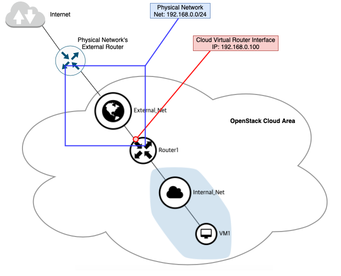 아직 인스턴스를 생성하지 않았지만, 추후에 인스턴스가 인터넷 접속이 필요한 경우를 위해 클라우드에서도 별도의 외부망을 생성하여 물리망과 연결해야 합니다. 이 네트워크는 오픈스택 토폴로지로 볼 때 하나의 가상 네트워크로 표현되지만(아래 그림에서 External_Net), 사실은 실제 물리 네트워크와 같은 대역의 네트워크를 의미합니다. (아래 그림에서 파란색 영역을 나타냅니다. 물론 이 부분은 관리자 별로 사내 네트워크와 어떻게 연동하여 구성하는가에 따라 달라질 수 있습니다만, 본 포스팅에서는 가장 기본적인 구성으로 진행한다는 점을 참고하시길 바랍니다)
