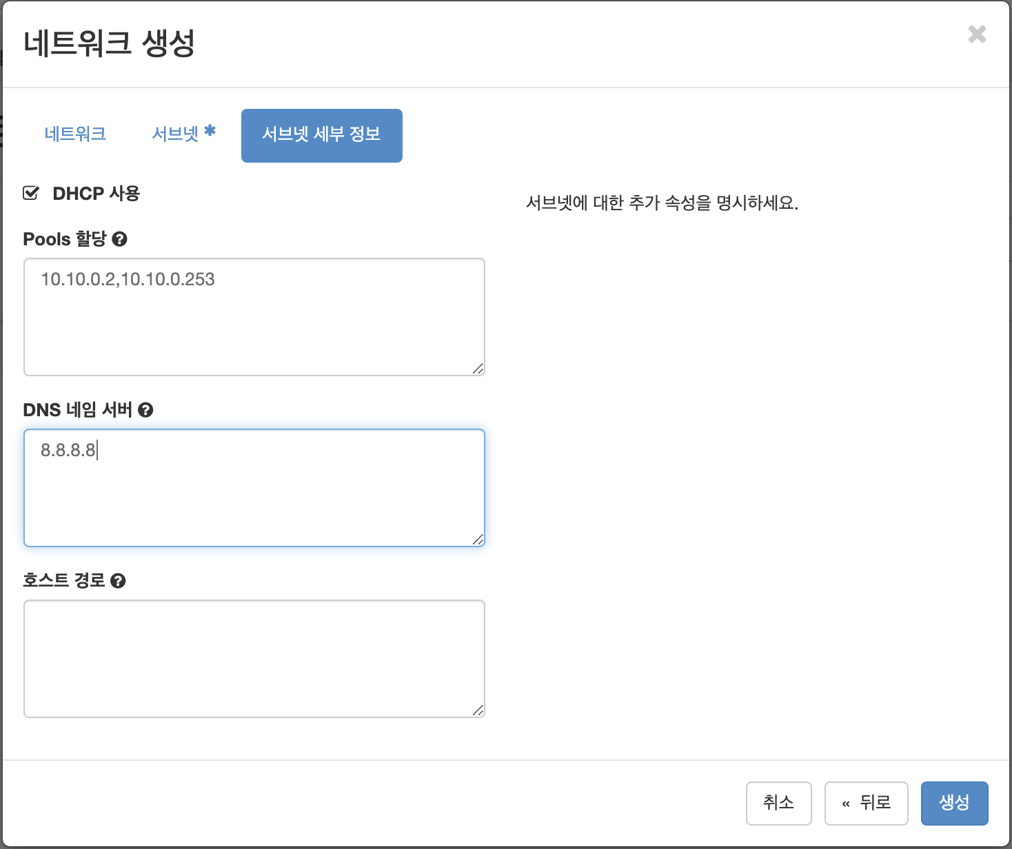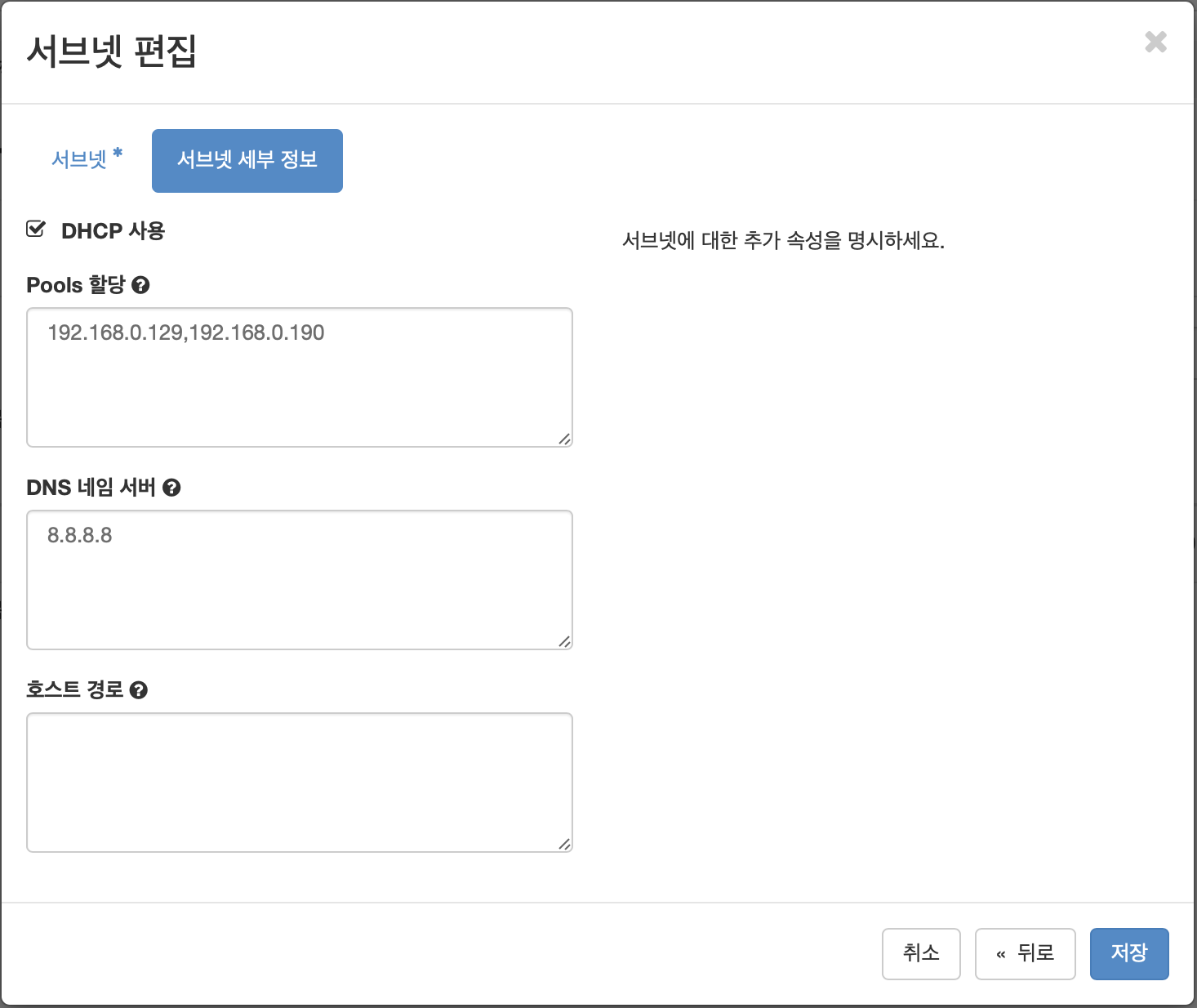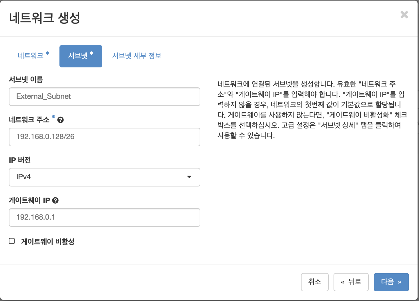 여기에서는 말 그대로 서브넷 정보를 입력하면 됩니다. 물론 물리망과 연결되어야 하므로 물리 네트워크의 범위 내에서 서브넷팅을 진행해야 합니다. 저의 경우, 마스크 비트를 26으로 하여 192.168.0.128~191.168.191 의 범위로 서브네팅하였습니다.