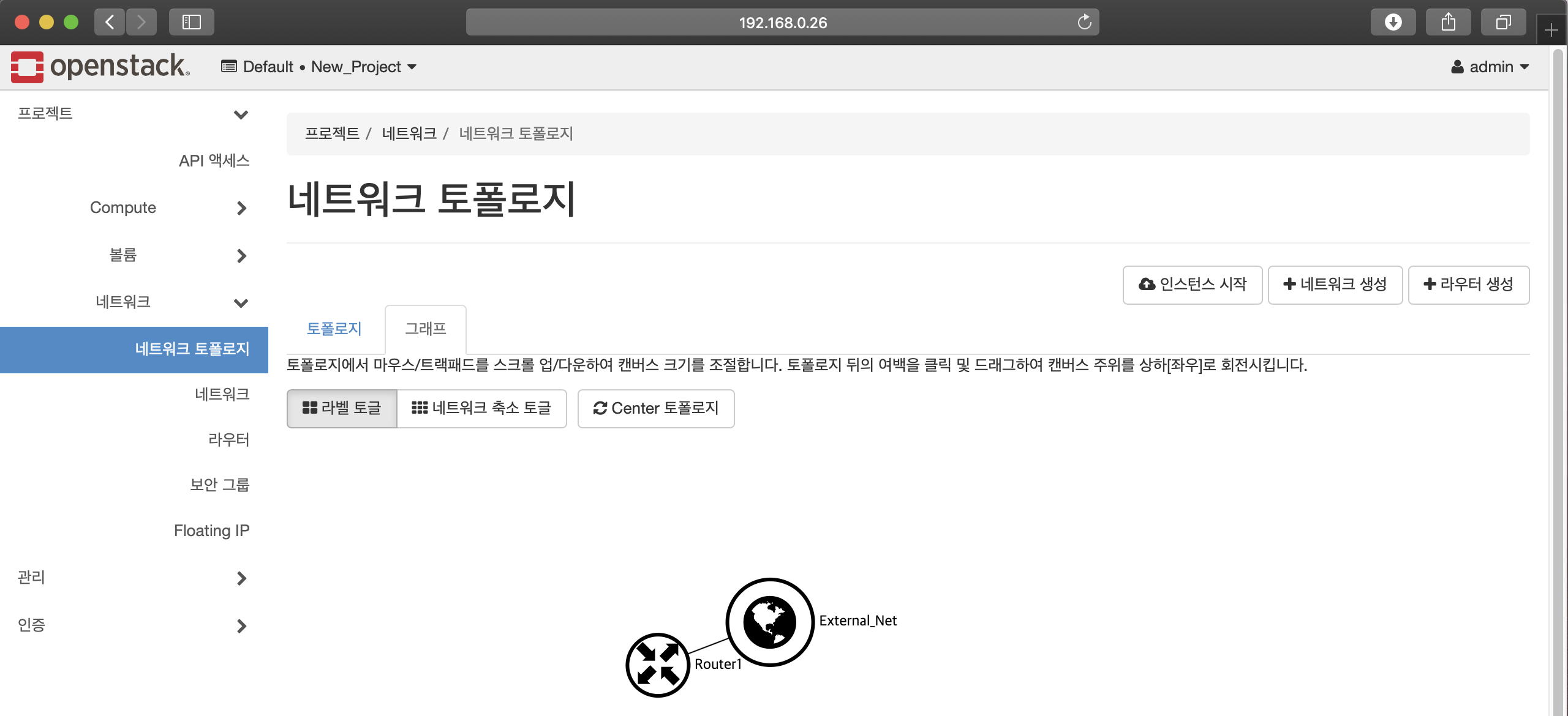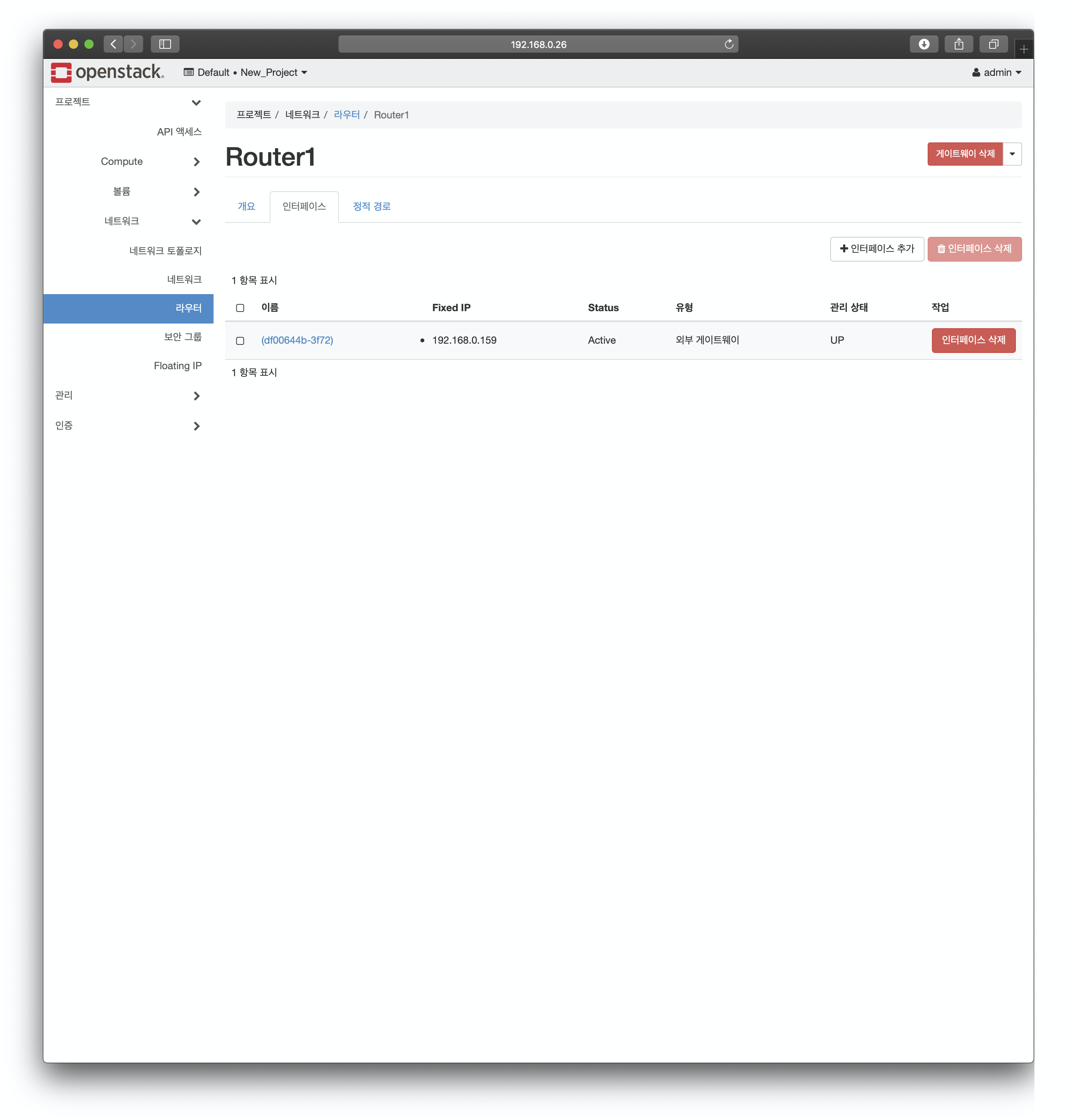 - Router1: 외부망과 내부망 사이에서 라우팅 기능을 수행하는 가상 라우터. New_Project에서 생성되며 admin프로젝트에서는 볼 수 없음.
