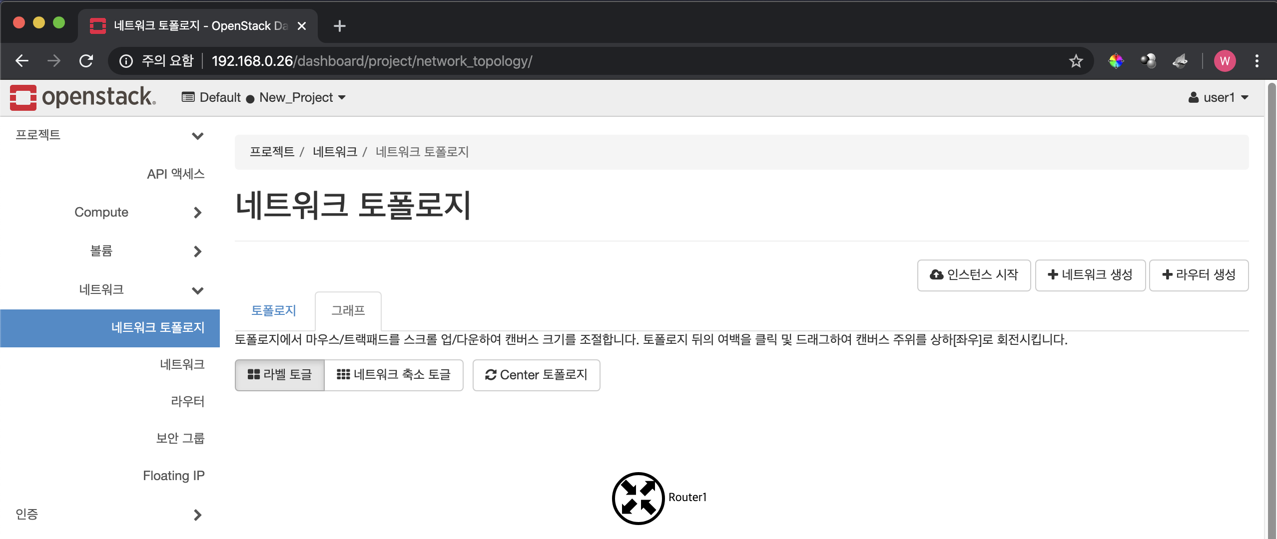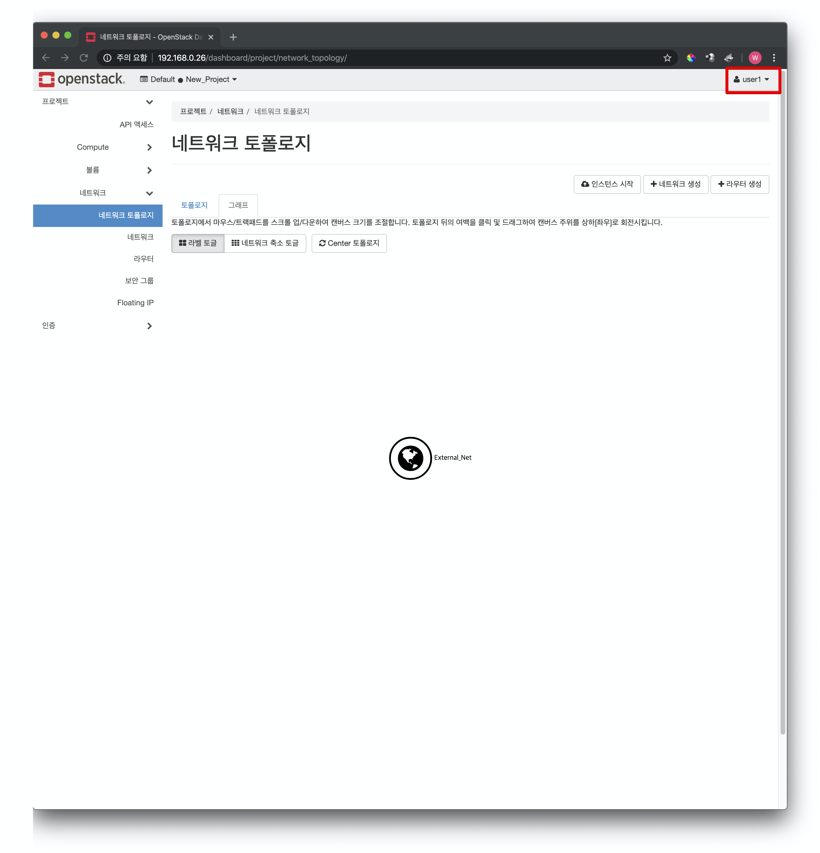 다시 user1로 로그인하여 네트워크 토폴로지를 살펴보면 External_Net 네트워크가 안보이는 것을 확인할 수 있습니다. (물론 admin 계정의 토폴로지에서는 여전히 볼 수 있습니다.)