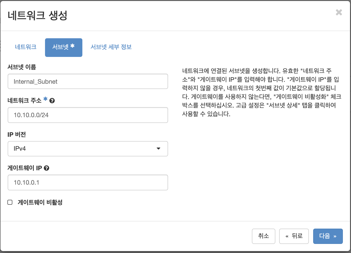 이름을 입력 후 서브넷 정보를 입력합니다.