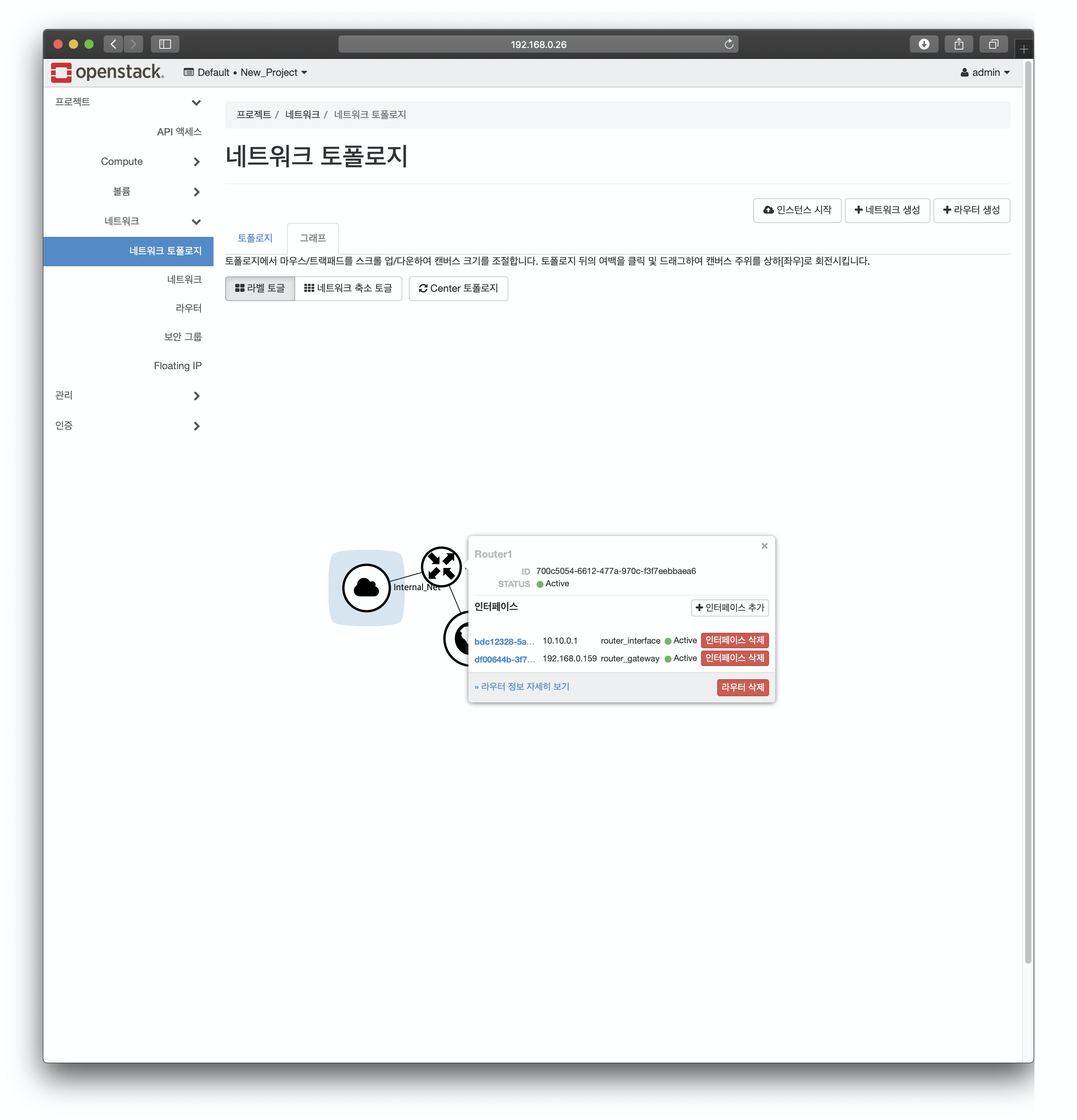 최종적으로 admin계정에서 네트워크 토폴로지로 확인해보면 다음과 같이 라우터에 내외부 네트워크의 인터페이스가 1개씩 추가된 것을 볼 수 있습니다.