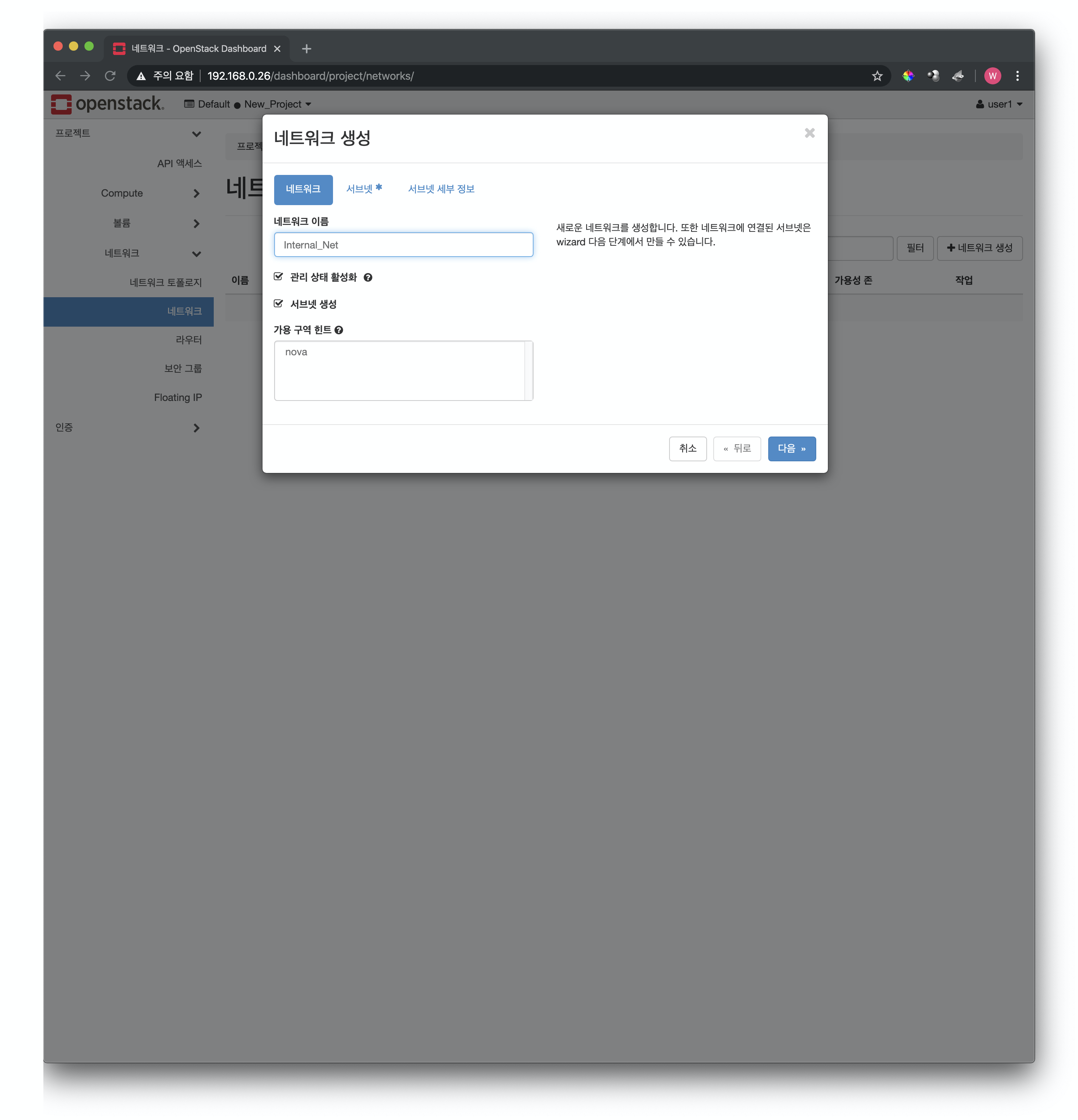 이번에는 내부 네트워크를 생성해 보겠습니다. 내부망은 user1로 생성해 보도록 하겠습니다.