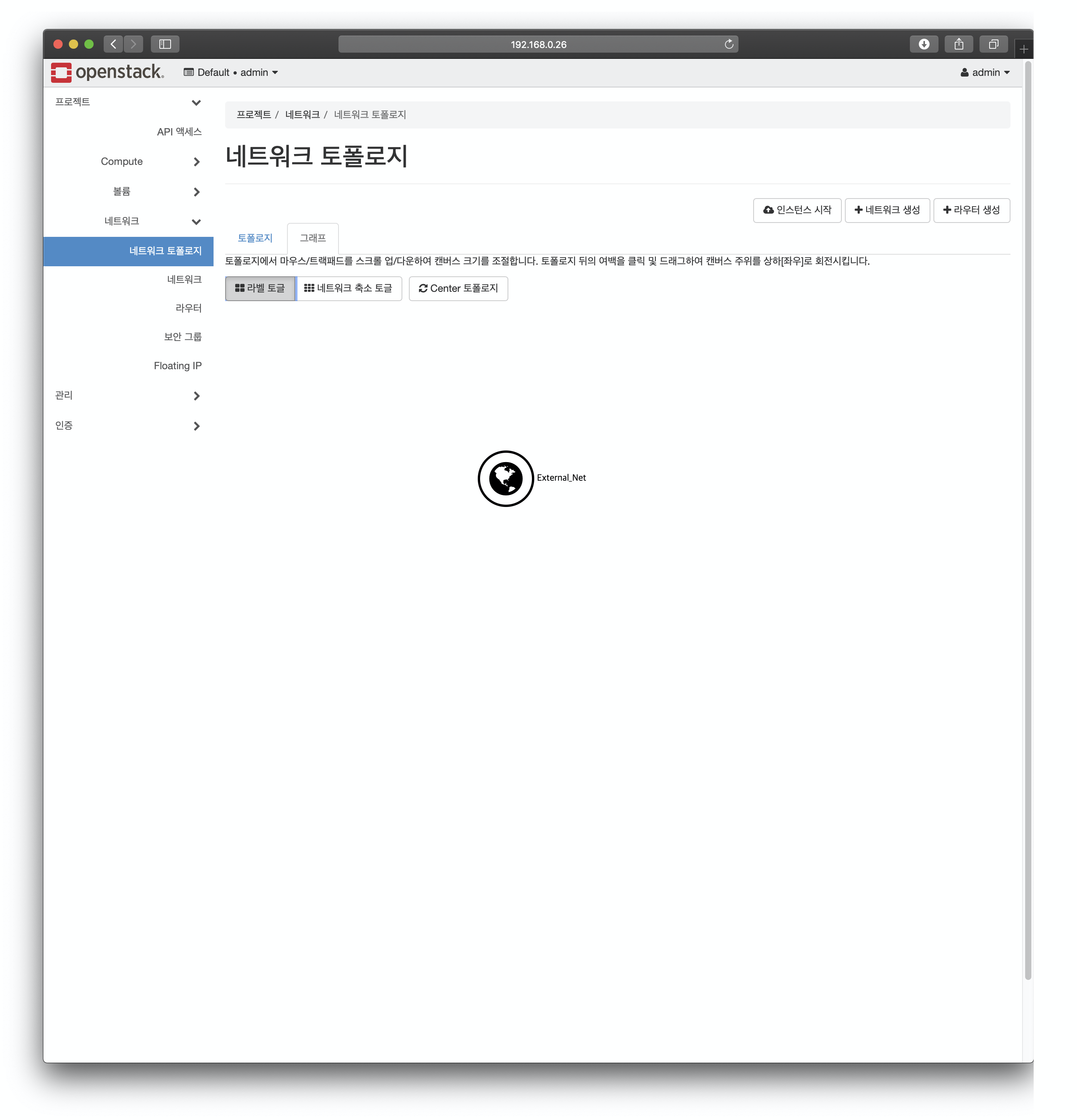 마지막으로 네트워크 토폴로지를 확인해 보겠습니다. admin과 user1의 계정으로 각각 로그인하여 비교해보면 admin의 경우 External_Net 네트워크까지 확인할 수 있지만, user1의 경우 라우터만 보이는 것을 확인할 수 있습니다.