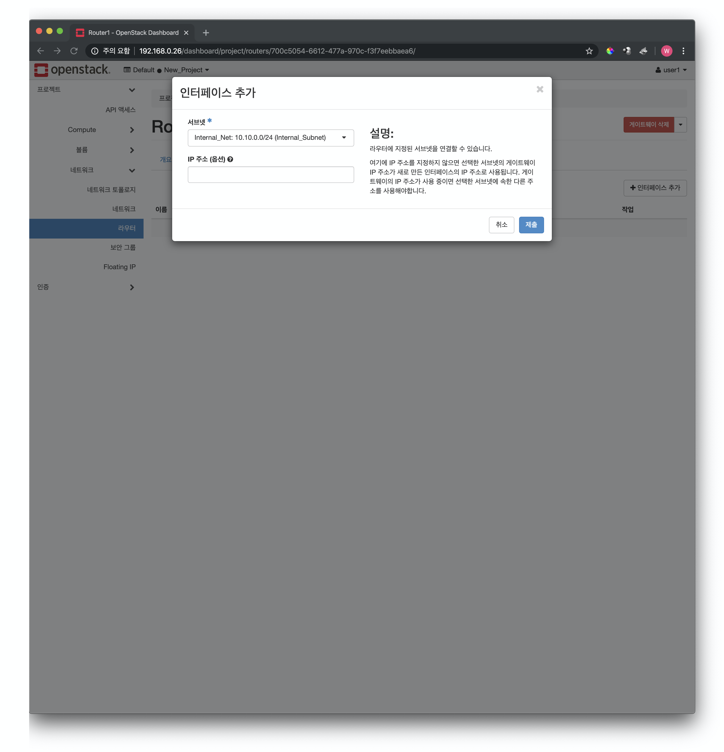 메뉴-> 프로젝트-> 네트워크-> 라우터로 이동하여 "Router1"을 클릭 후 "인터페이스" 탭으로 이동합니다. "인터페이스 추가"를 클릭 후 아래와 같이 방금 생성한 Internal_Net을 선택하고 제출을 클릭합니다.
