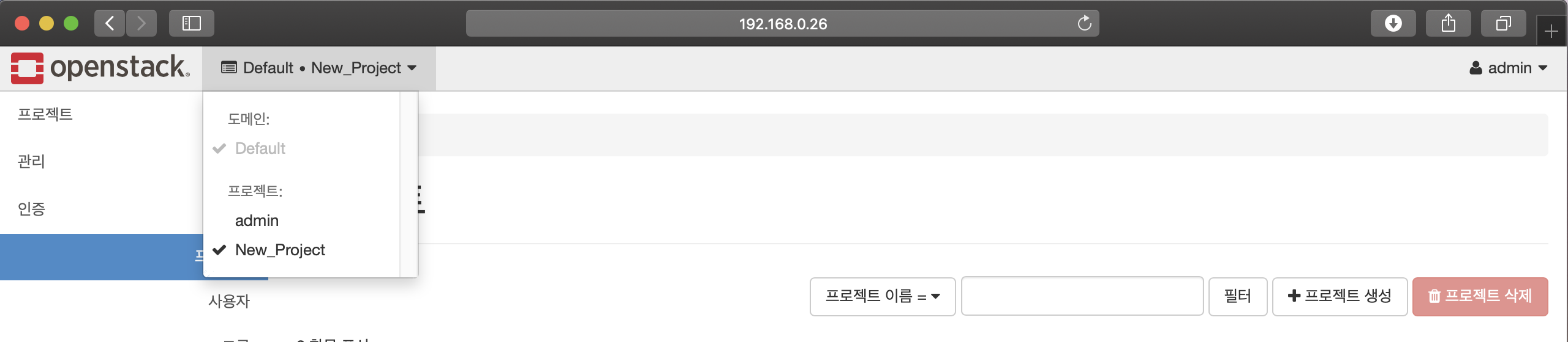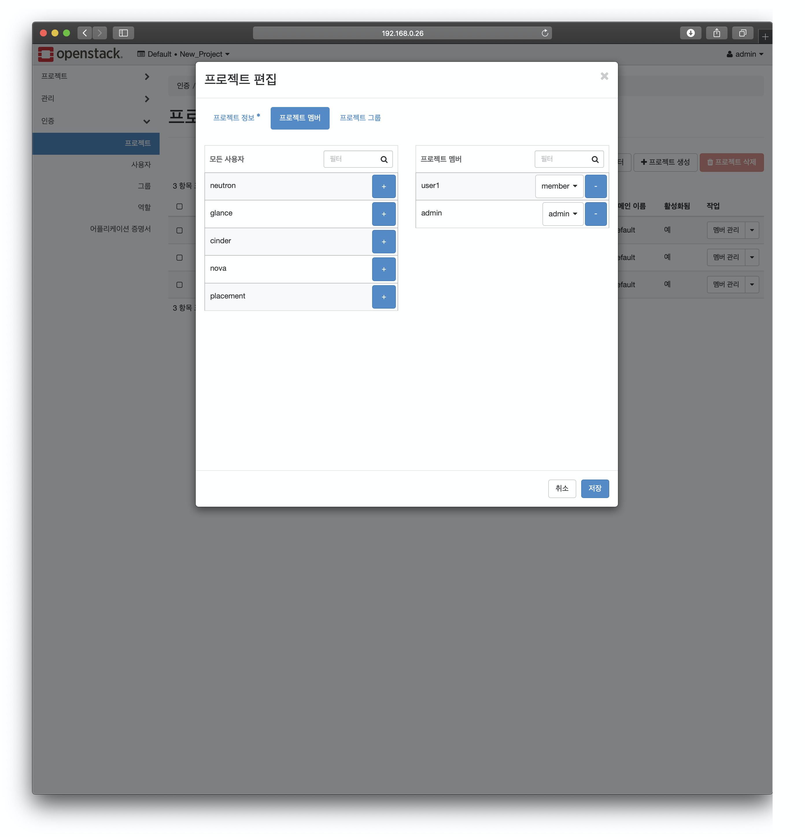 우선 admin으로 로그인 한 상태에서 메뉴-> 인증-> 프로젝트로 이동하여 New_Project의 "멤버관리"를 클릭 후 "프로젝트 멤버" 탭에서 admin을 관리자로 추가해 줍니다. (물론 user1에게 admin계정을 부여하여 진행할 수도 있지만, 그러면 너무 많은 권한이 일반 사용자에게 부여되므로 저는 기존 admin을 프로젝트에 추가시켰습니다)