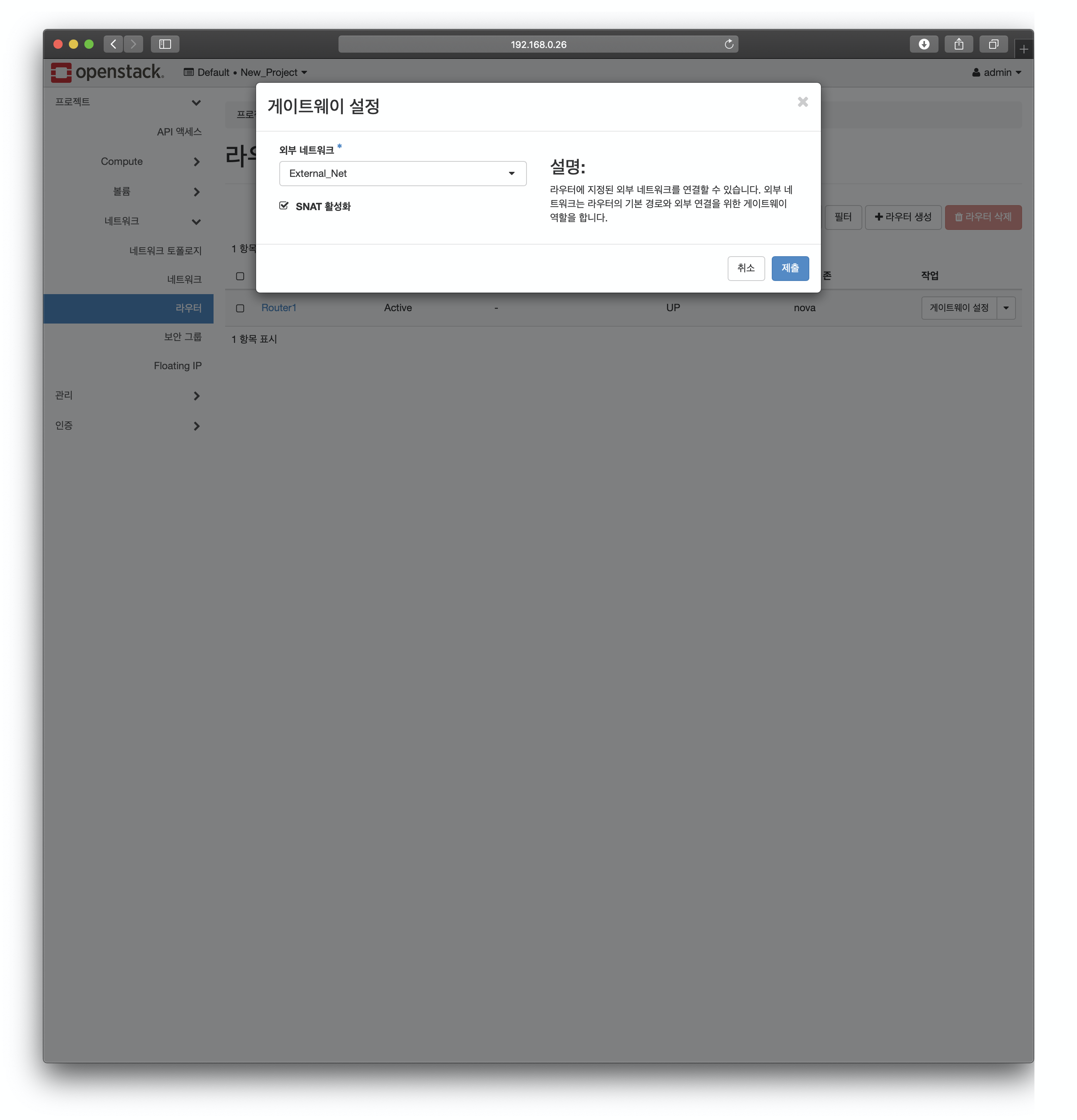 이제 "Router1" 생성되었고 오른편에 "게이트웨이 설정"을 볼 수 있습니다. 이를 클릭해보면 외부 네트워크로 기존에 생성한 External_Net을 볼 수 있습니다.