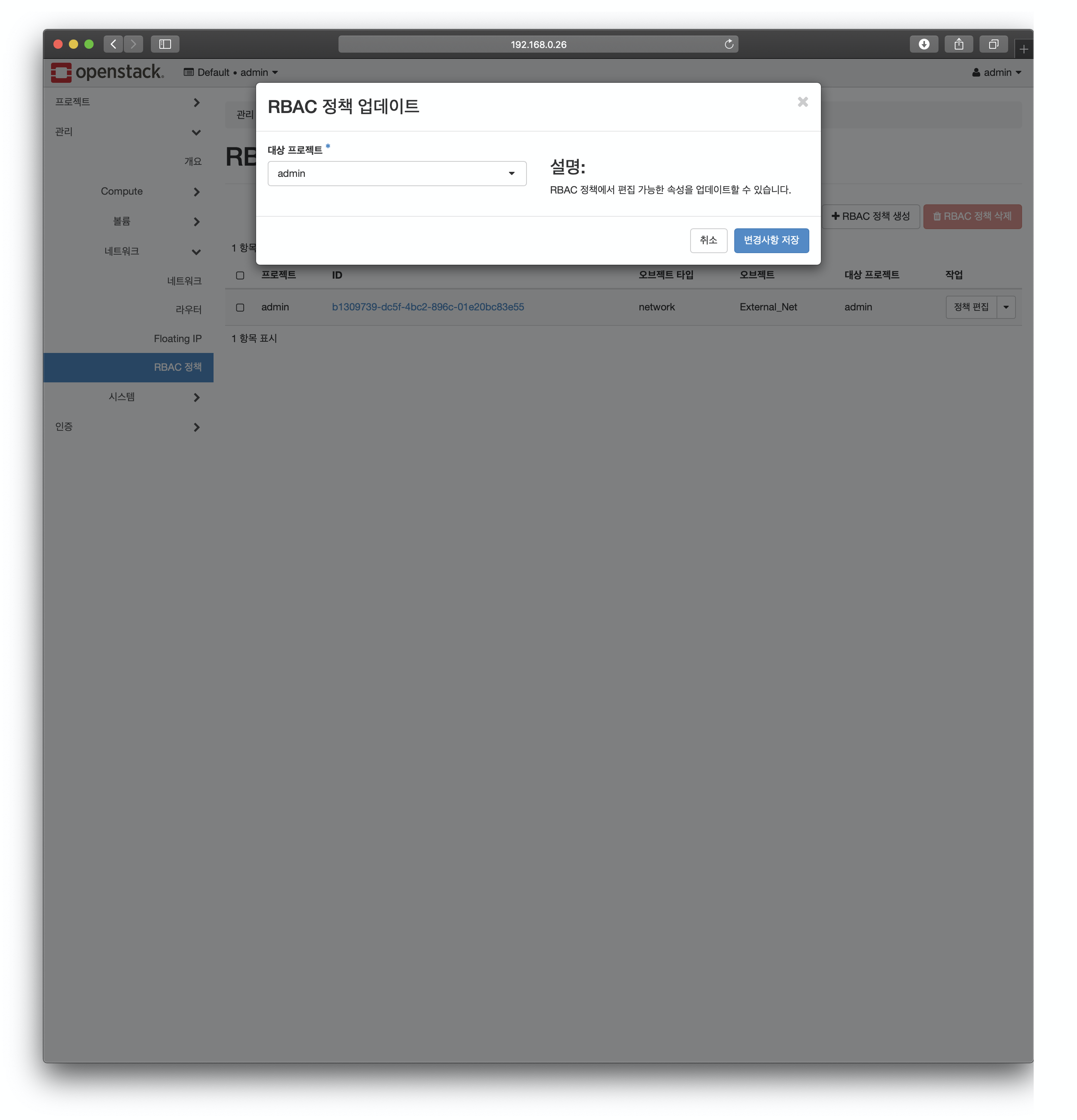 로그인 후 메뉴-> 관리-> 네트워크-> RBAC 정책에서 아래와 같이 External_Net 의 정책 편집을 클릭하여 대상 프로젝트를 admin으로 설정해 봅니다. 이제 External_Net은 admin만 접근하고 제어할 수 있습니다.