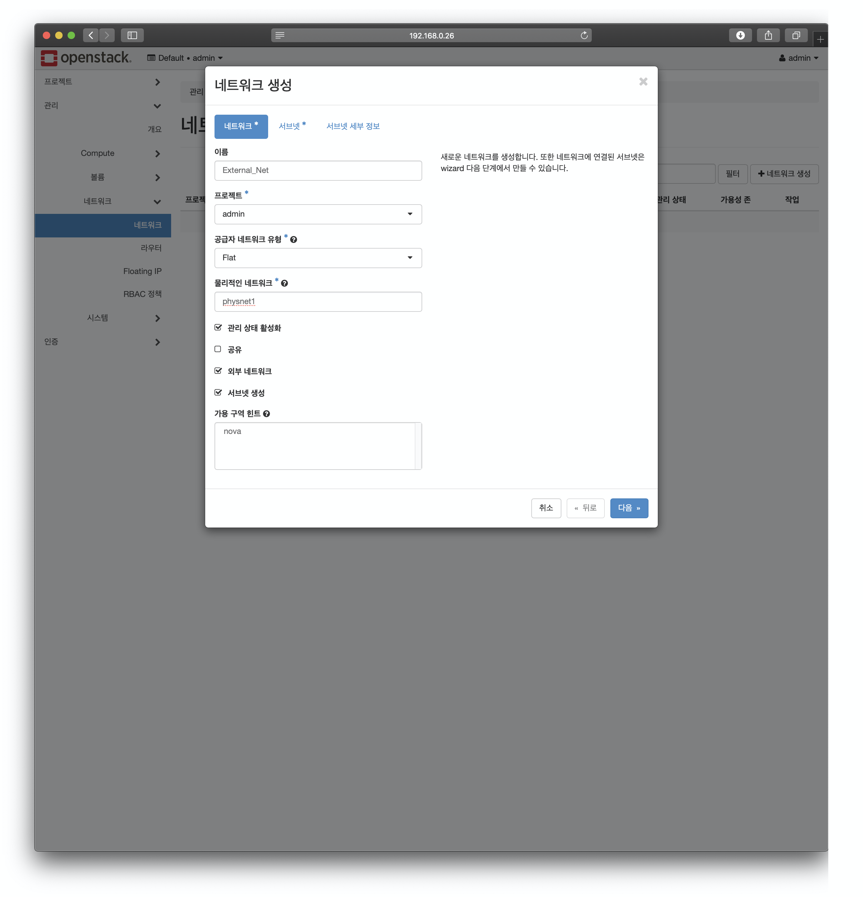 우선 다음과 같이 admin 계정으로 로그인 후 메뉴-> 관리-> 네트워크-> 네트워크에서 "네트워크 생성"을 클릭합니다.