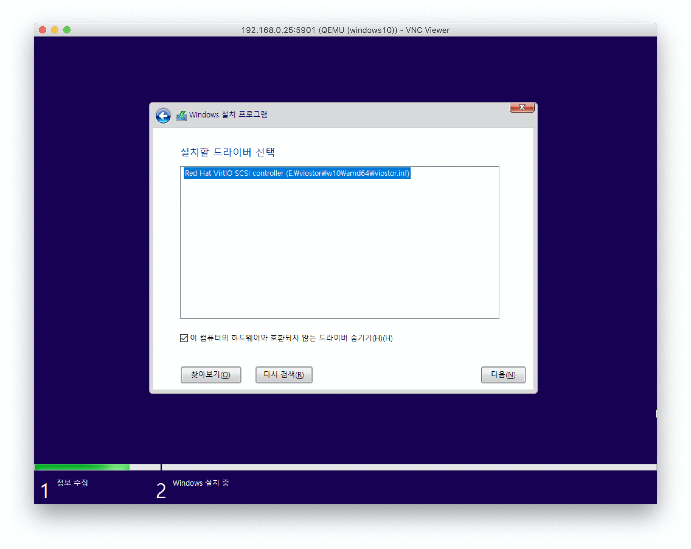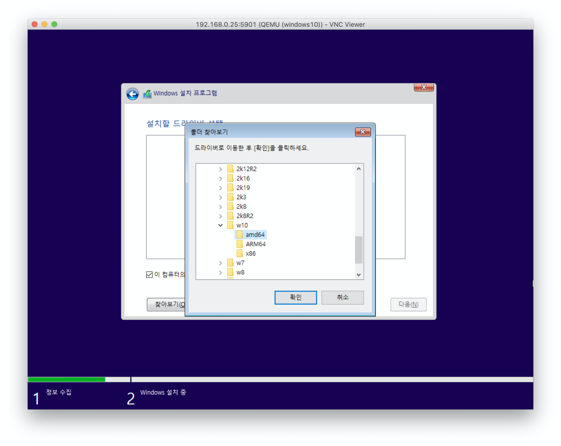 E:드라이브에 virtio 드라이버가 마운트 된 것을 확인할 수 있습니다. 왜냐하면 우리는 앞서 virt-install 단계에서 virtio 드라이버를 디스크로 넣어줬기 때문입니다. 이제 E:\viostor\w10\amd64 를 선택하고 확인을 클릭합니다.