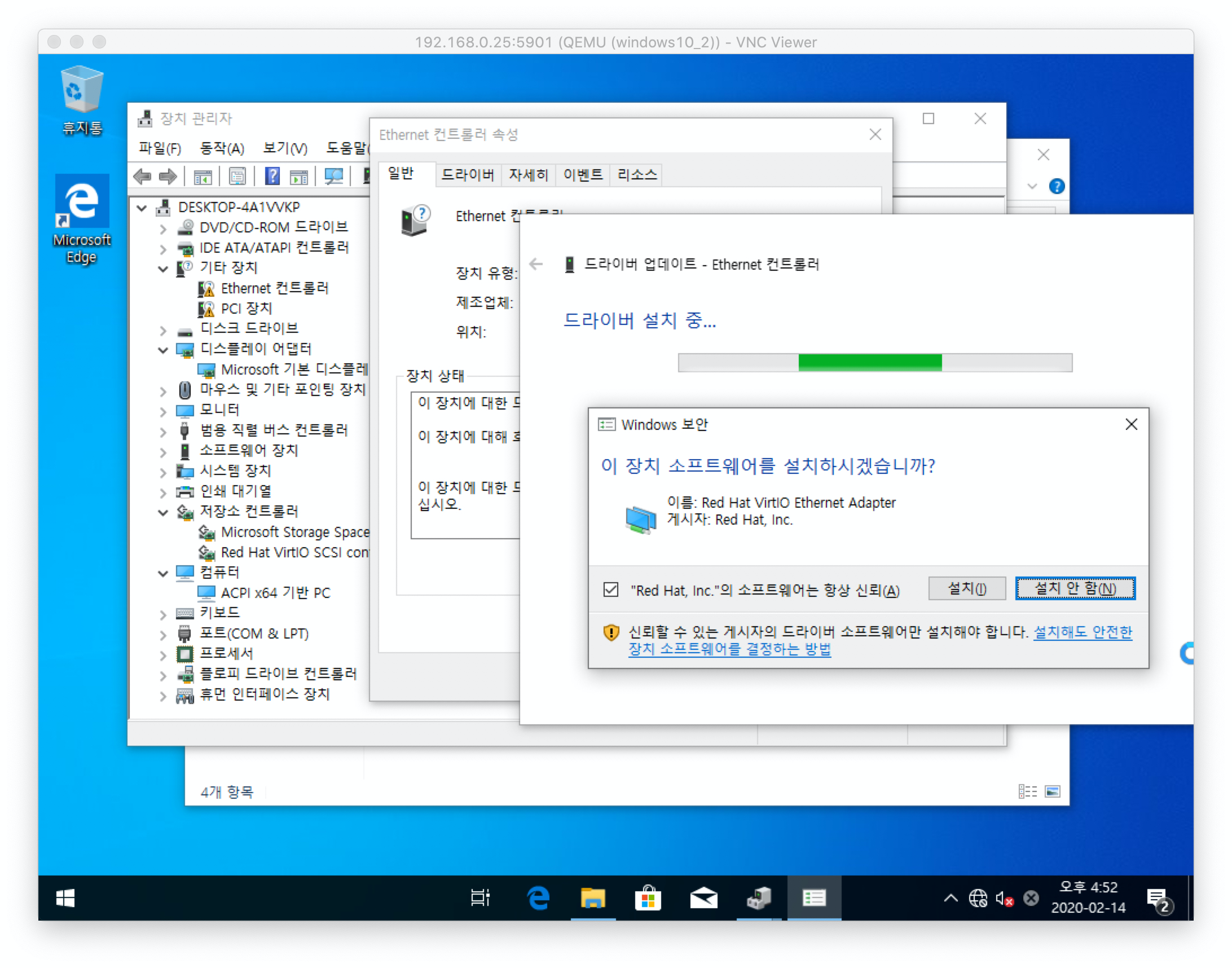 마운트한 virtio를 사용하여 다음과 같이 내PC-> 장치관리자-> 기타 장치-> Ethernet 컨트롤러, PCI 장치 등을 업데이트 해줍니다. virtio 디스크에서 검색하면 아래와 같이 드라이버를 찾을 수 있습니다.