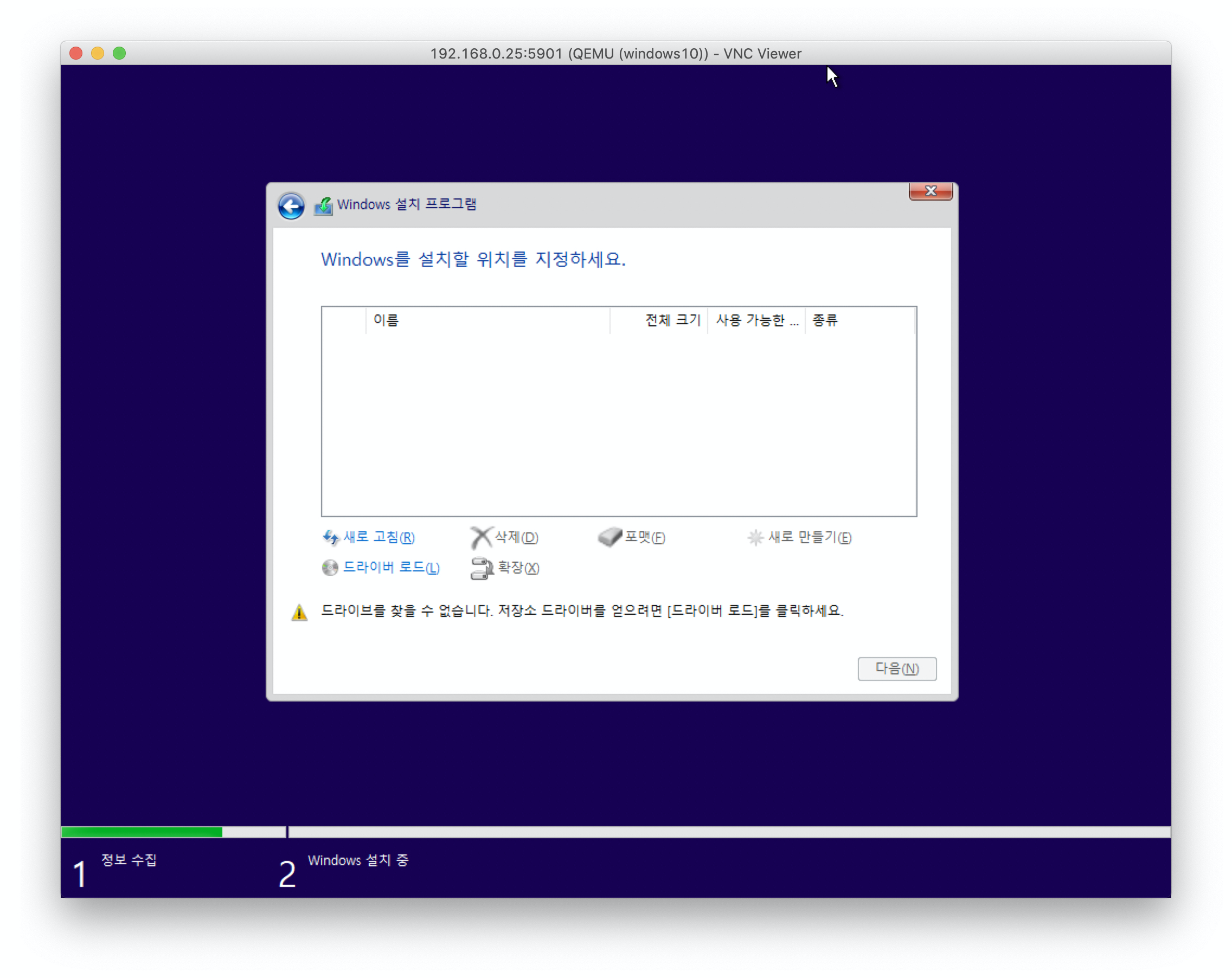 윈도우 설치 과정에서는 리눅스와 달리 다음과 같이 어떠한 디스크도 탐지되지 않는 것을 볼 수 있습니다.