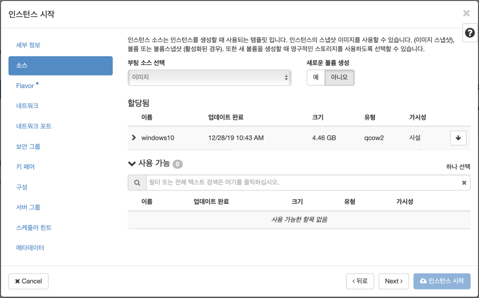 소스에서는 "부팅소스": 이미지, "새로운 볼륨 생성": 아니오, "할당됨": windows10 이미지를 선택(화살표 클릭으로 위로 올림) 합니다.