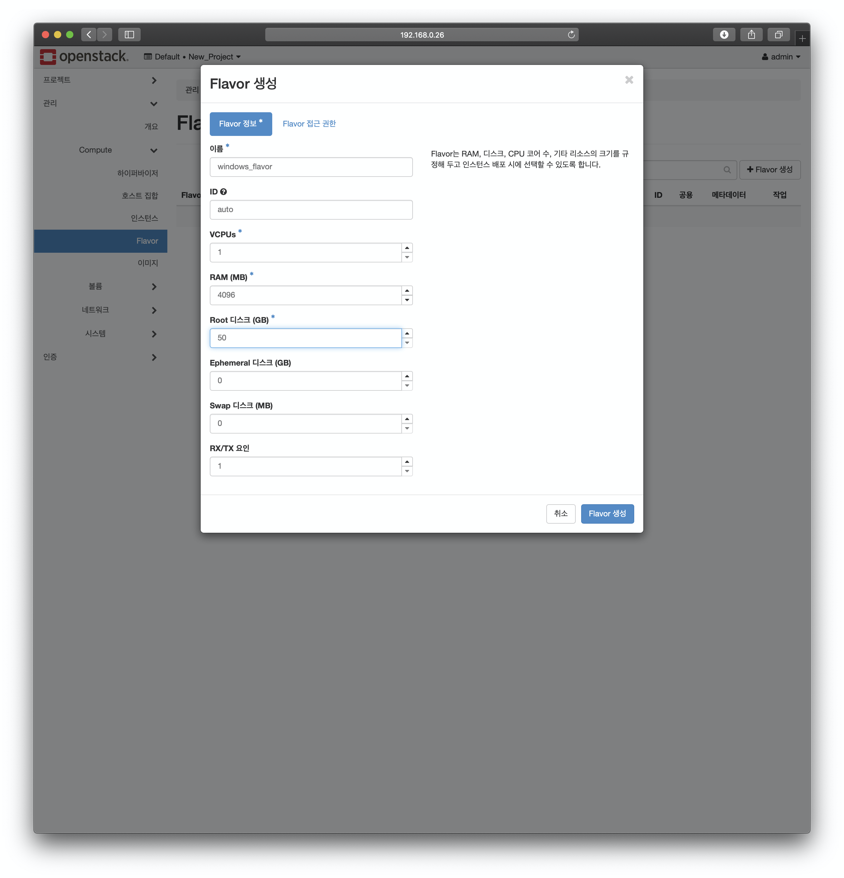메뉴-> 관리-> Flavor로 이동 후 "Flavor 생성"을 클릭하고 다음과 같이 인스턴스 생성에 필요한 자원 할당량을 정의합니다.