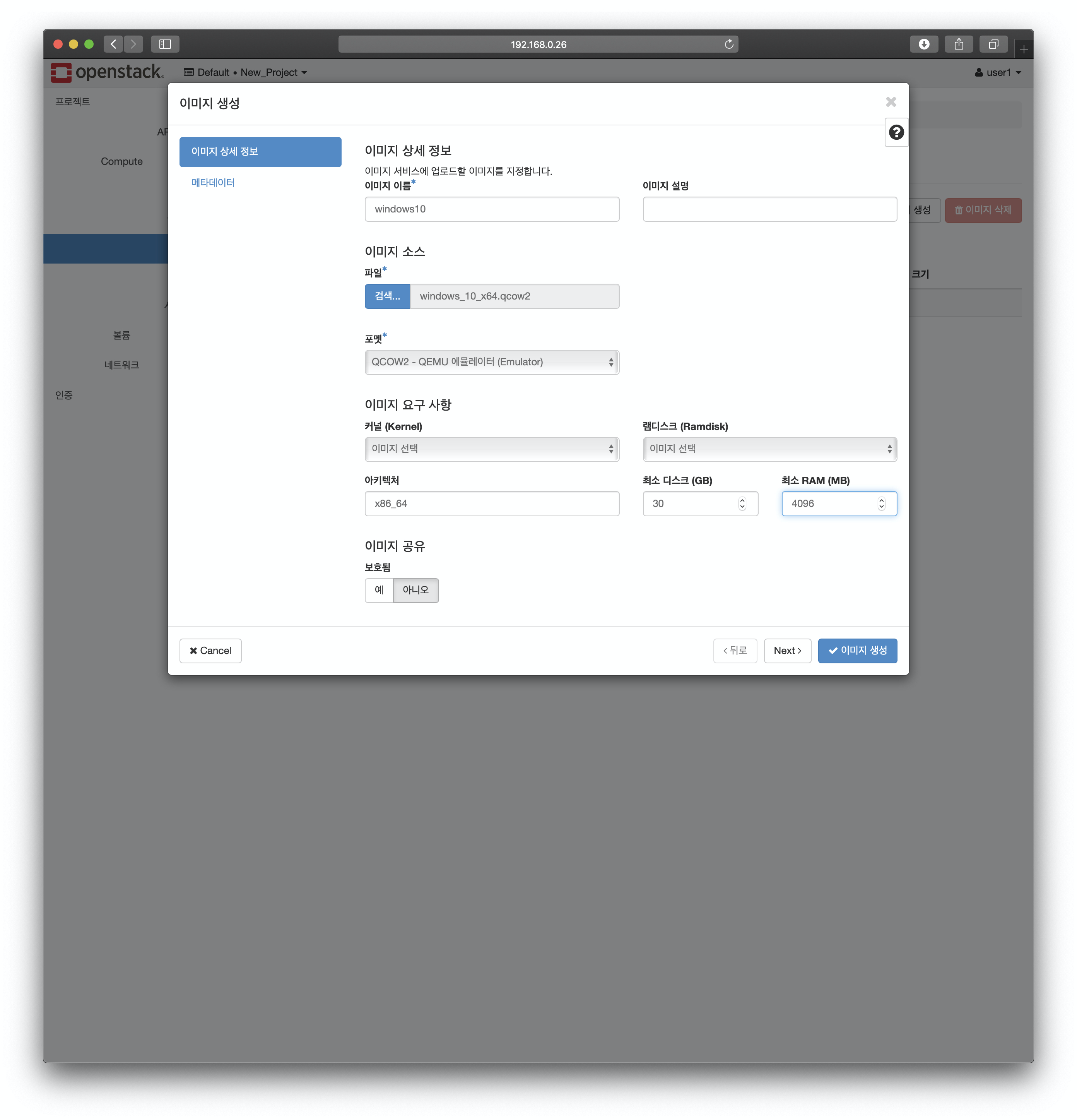 이번 포스트에서는 가상머신 이미지 디스크를 업로드하고 그 이미지를 가지고 인스턴스(VM)를 생성하는 단계까지 진행해 보도록 하겠습니다. 물론 이번 과정도 전부 CLI로 가능하지만 저는 이전에 구축한 오픈스택 대시보드를 사용하도록 하겠습니다.