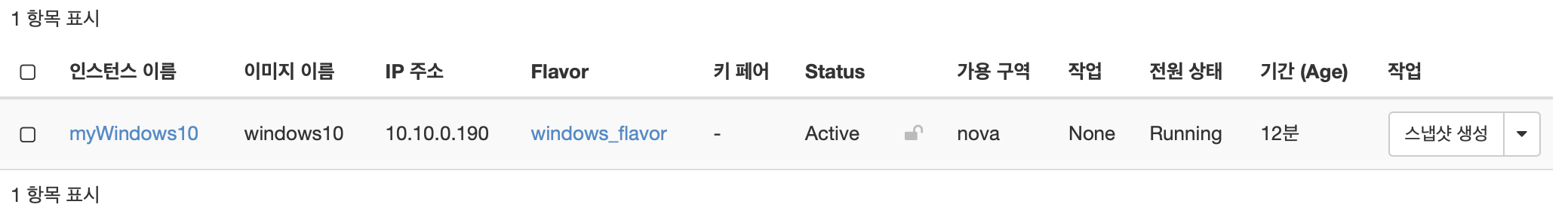 아래와 같이 Running 상태로 바뀌면 인스턴스가 정상적으로 생성된 것입니다. (저는 약 10분 정도 걸렸네요) 만약 에러가 나면 Error로 표기됩니다. Ip 주소도 10.10.0.190으로 할당 되었습니다.