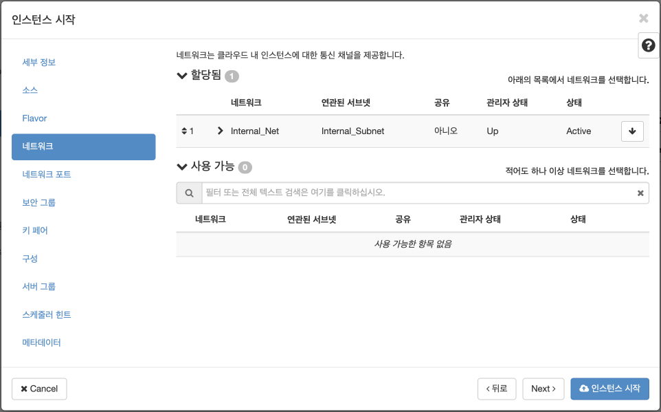 "네트워크"에는 이전 포스트에서 생성했던 네트워크 "Internal_Net"이 자동으로 잡혀있습니다. 만약 네트워크를 아직 생성하지 않았다면 네트워크 생성 포스트를 참고하셔서 먼저 생성한 후에 다시 인스턴스 생성 절차를 진행하시기 바랍니다.