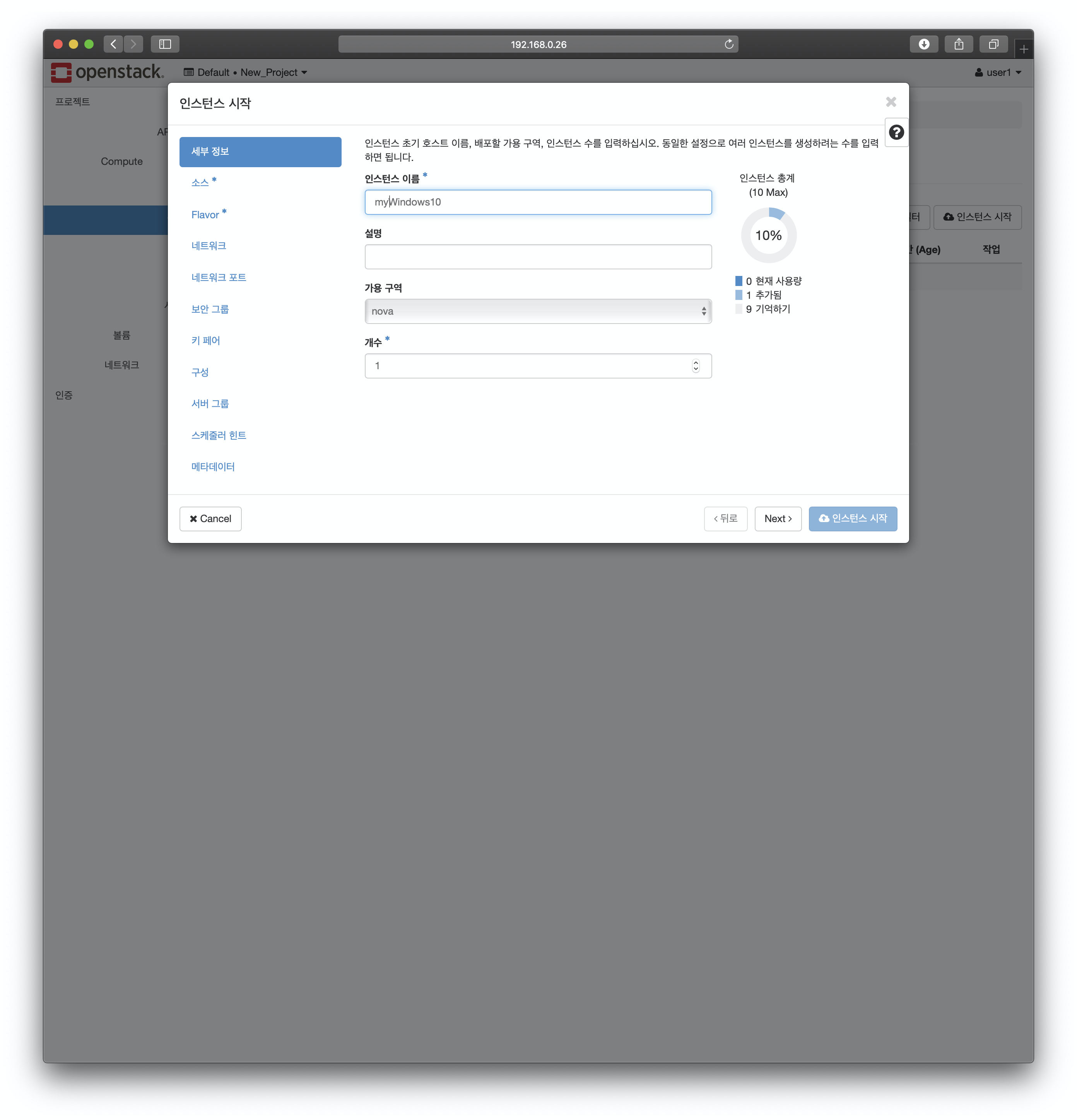 대시보드에서 사용자 계정으로 로그인 후 메뉴-> 프로젝트-> Compute-> 인스턴스로 이동합니다. "인스턴스 시작"을 클릭하면 다음과 같이 인스턴스 설정 정보를 출력합니다.