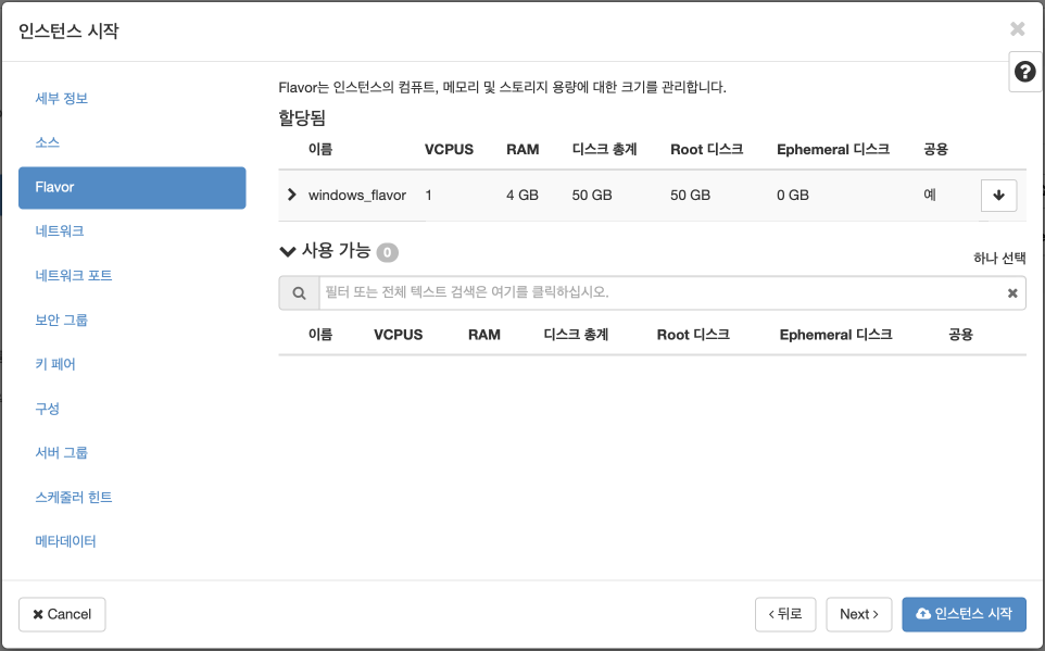 필수 사항은 위의 메뉴에 보이는 "세부정보", "소스", "Flavor", "네트워크" 입니다.