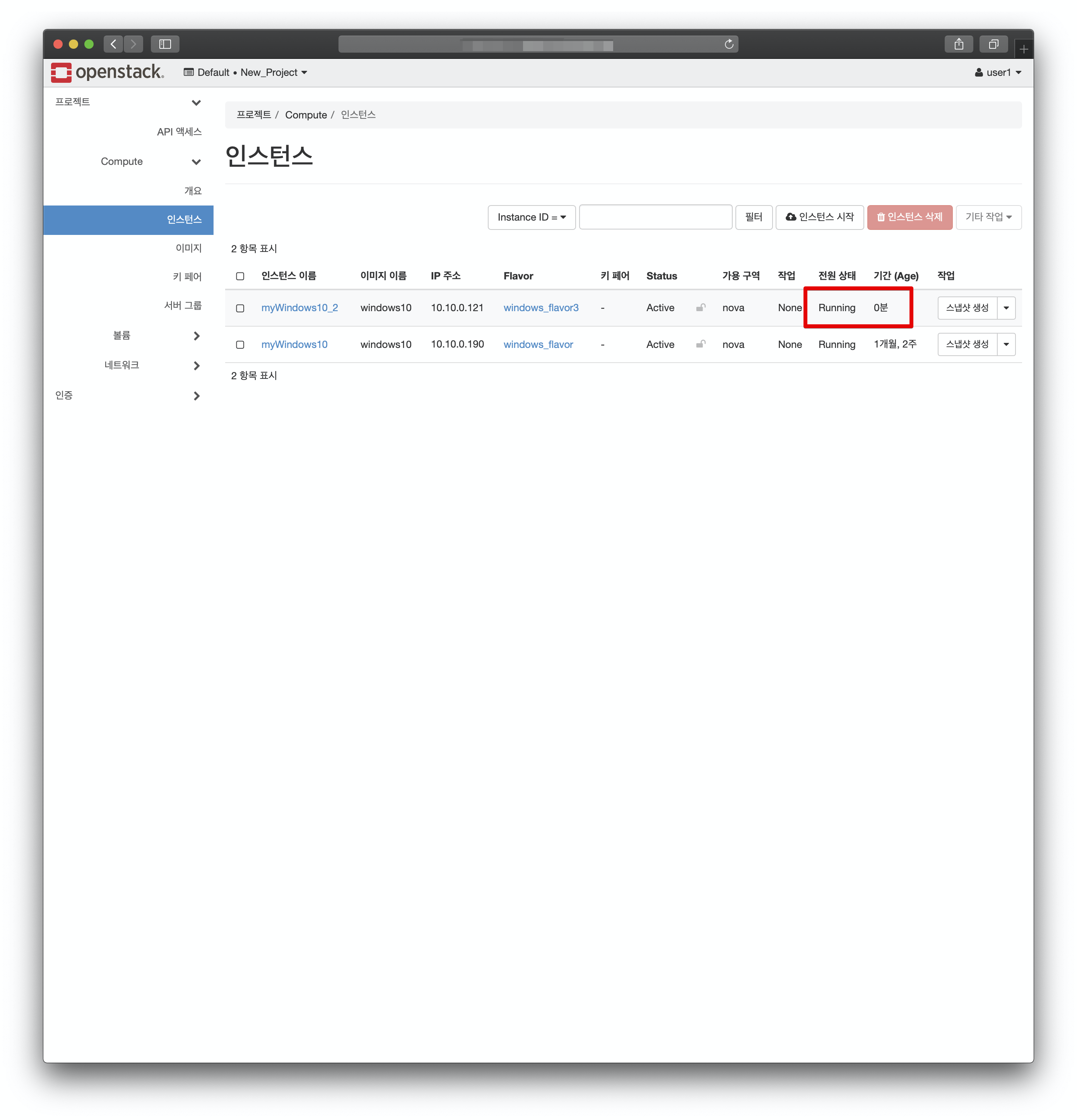 방금 만든 가상머신까지 총 2개의 가상머신이 현재 동작중인 것을 볼 수 있습니다. 문제는 어떤 인스턴스가 기존의 것이고 방금 생성한 것인지 구분이 잘 되지 않습니다. 다음과 같이 인스턴스의 이미지를 확인하면 됩니다.