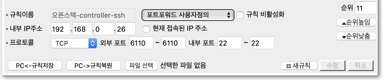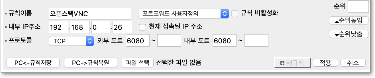 다음과 같이 포트포워드 설정 창에서 +새규칙 추가 클릭 후 아래와 같이 자신이 연결하고자 하는 서비스 관련 정보를 입력합니다.